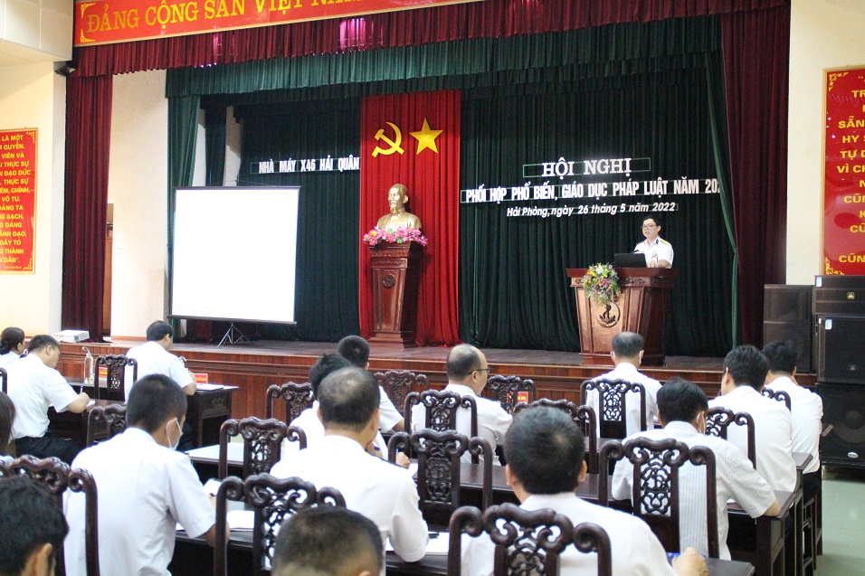Ngày 26/5, tại Hải Phòng, Nhà máy X46, Cục Kỹ thuật Hải quân phối hợp với Tòa án Quân sự Quân chủng Hải quân tổ chức Hội nghị phổ biến, giáo dục pháp luật năm 2022.