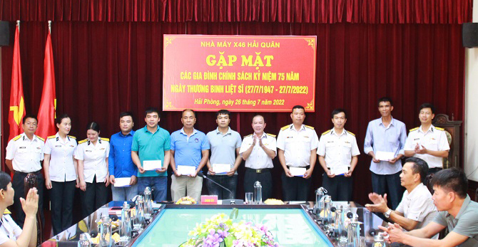 Ngày 25 và 26/7, Nhà máy X46, Cục Kỹ thuật Hải quân tổ chức thăm, tặng quà một số gia đình chính sách trên địa bàn đóng quân, đơn vị kết nghĩa và đối tượng chính sách đang công tác tại Nhà máy.