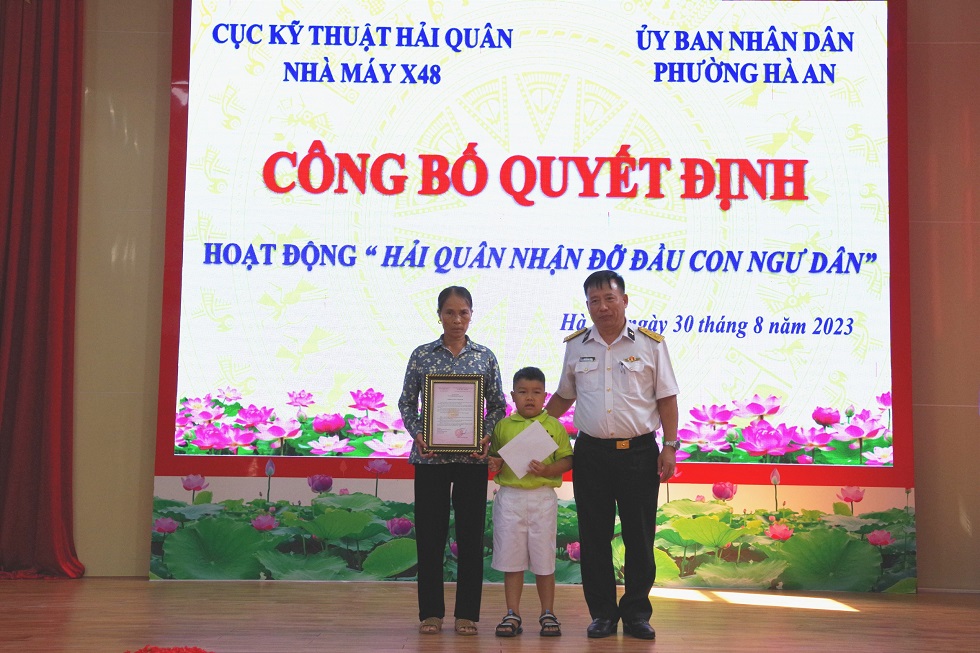 Ngày 30/8, tại UBND phường Hà An, thị xã Quảng Yên, tỉnh Quảng Ninh, Nhà máy X48, Cục Kỹ thuật Hải quân phối hợp với cấp ủy, chính quyền địa phương tổ chức Lễ công bố quyết định “Hải quân nhận đỡ đầu con ngư dân”.