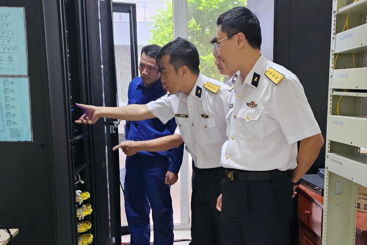 Chỉ huy Nhà máy X52 kiểm tra hạ tầng công nghệ thông tin. Ảnh: VQ