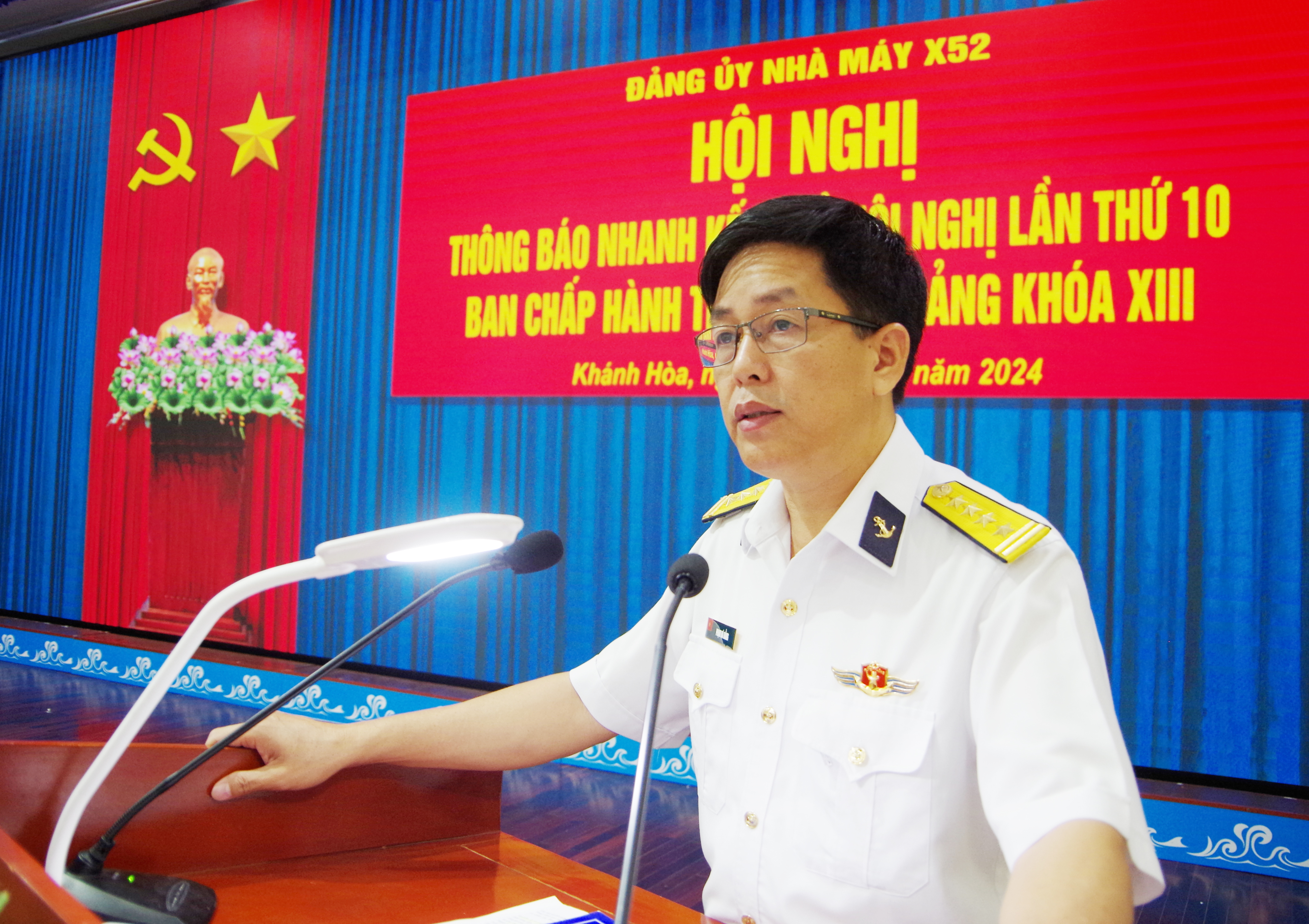 Sáng 22/10, tại TP.Cam Ranh, tỉnh Khánh Hòa, Đảng ủy Nhà máy X52, Cục Kỹ thuật Hải quân tổ chức Hội nghị thông báo kết quả Hội nghị lần thứ 10 Ban Chấp hành Trung ương Đảng khóa XIII cho cán bộ, đảng viên. Đại tá Phạm Bá Bằng, Bí thư Đảng ủy, Chính ủy Nhà máy chủ trì hội nghị.