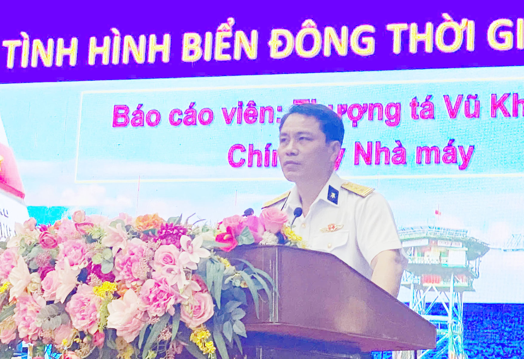 Thượng tá Vũ Khắc Trị, Chính ủy Nhà máy X55 đã thông tin khái quát về vị trí, vai trò, tầm quan trọng của biển đảo Việt Nam trong sự nghiệp xây dựng và bảo vệ Tổ quốc; quan điểm, chủ trương của Đảng ta trong xử lý các vấn đề liên quan đến biển đảo; tình hình trên 2 quần đảo Hoàng Sa và Trường Sa; hoạt động bảo vệ chủ quyền biển đảo của Hải quân nhân dân Việt Nam trong thời gian gần đây và dự báo tình hình Biển Đông thời gian tới.