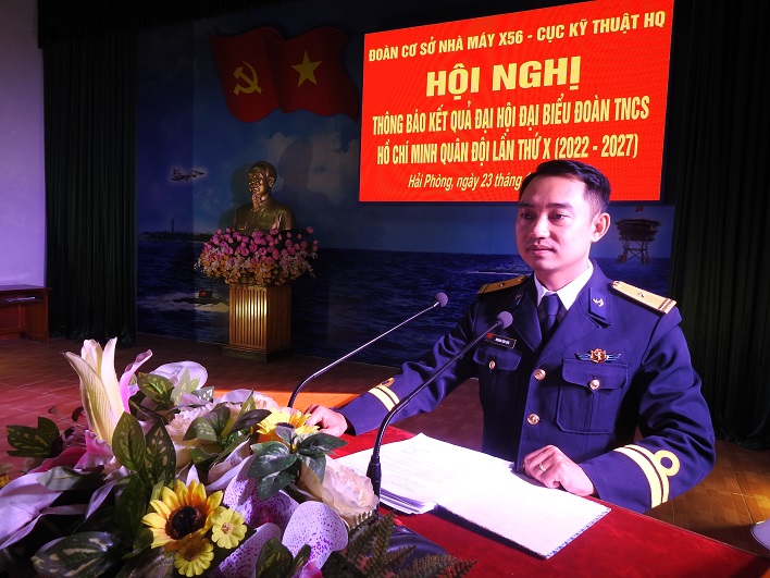 Sáng 23/11, tại TP. Hải Phòng, Đoàn cơ sở Nhà máy X56, Cục Kỹ thuật Hải quân tổ chức tuyên truyền kết quả Đại hội đại biểu Đoàn TNCS Hồ Chí Minh Quân đội lần thứ X (2022-2027). Đại tá Lê Hùng Tiến, Bí thư Đảng ủy, Chính ủy Nhà máy dự và chỉ đạo.