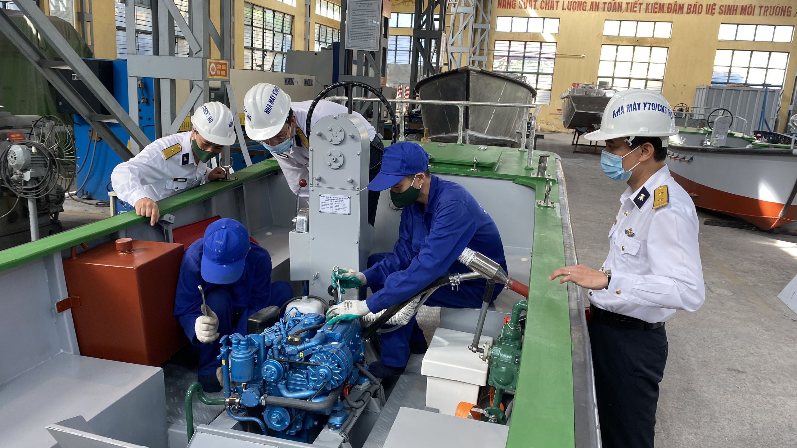 Cán bộ, nhân viên Nhà máy X70 lắp đặt máy cho xuồng chuyển tải