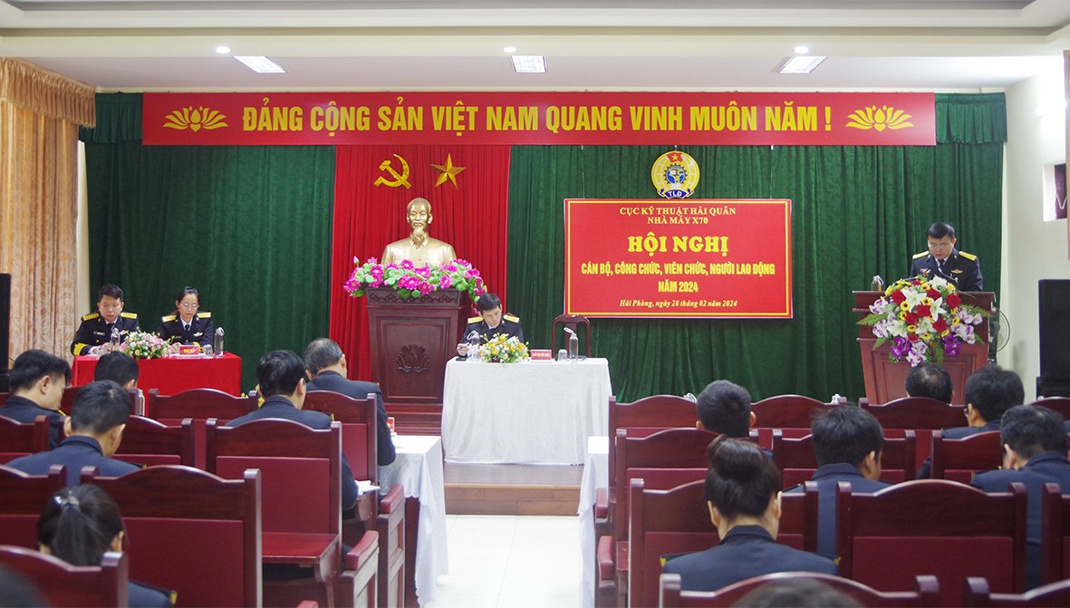 Sáng 28/2, tại TP. Hải Phòng, Nhà máy X70, Cục Kỹ thuật Hải quân tổ chức Hội nghị cán bộ, công chức, viên chức, người lao động năm 2024. Đại tá Hoàng Hữu Sơn, Phó Chủ nhiệm Chính trị Cục Kỹ thuật Hải quân dự, chỉ đạo.