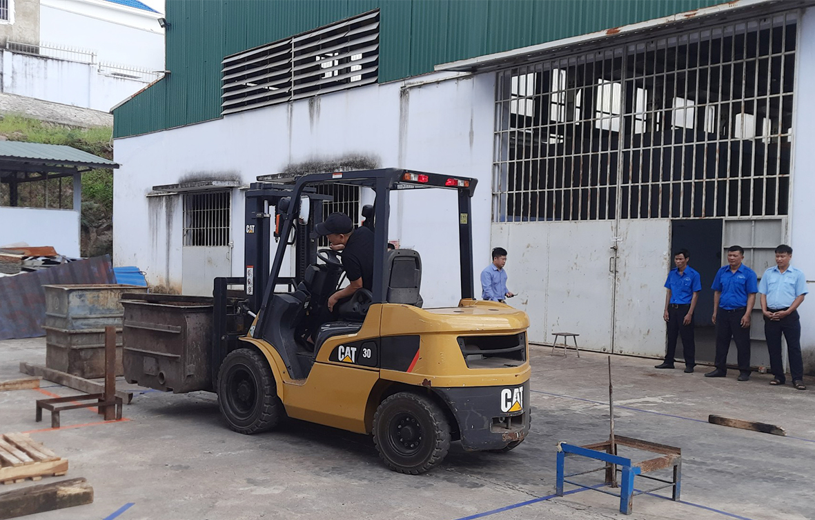 Hình thức tập huấn kết hợp lên lớp lý thuyết và thực hành trực tiếp trên máy móc, thiết bị có yêu cầu nghiêm ngặt về an toàn lao động tại các xưởng.