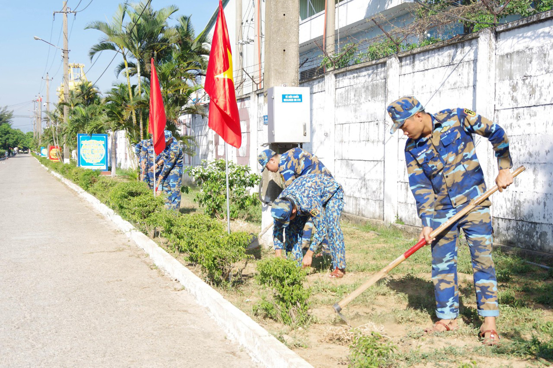 Các thành viên CLB "Môi trường xanh" Đoàn cơ sở Lữ đoàn 161 chăm sóc cây xanh. Ảnh: Hoàng Diệu