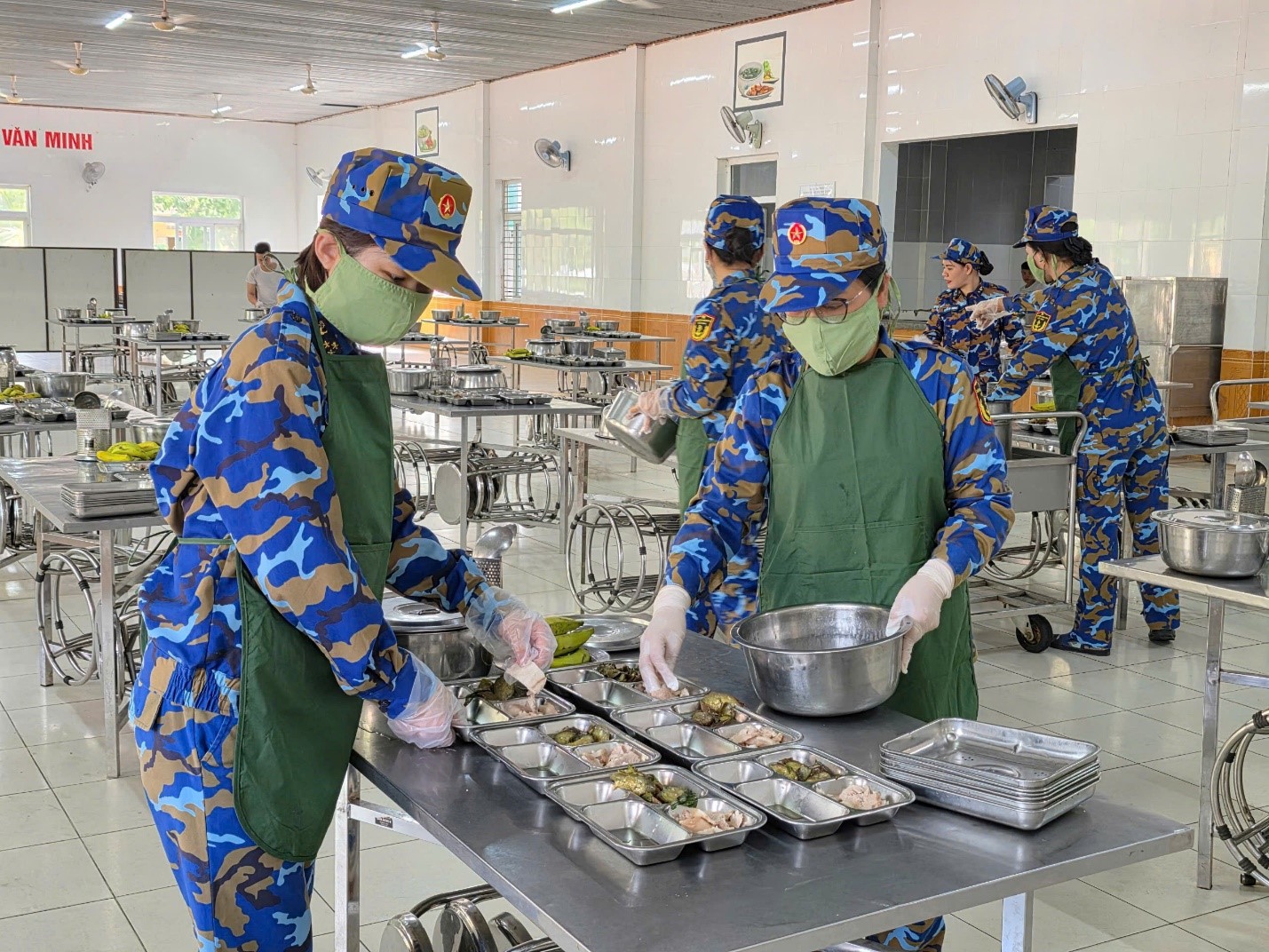 Cán bộ, hội viên phụ nữ phối hợp với đơn vị chế biến, trình bày “bữa cơm tự quản”