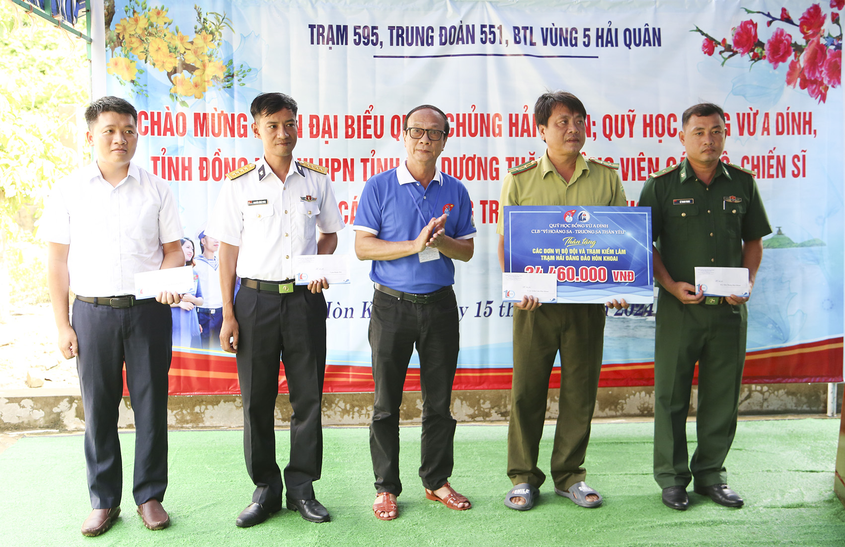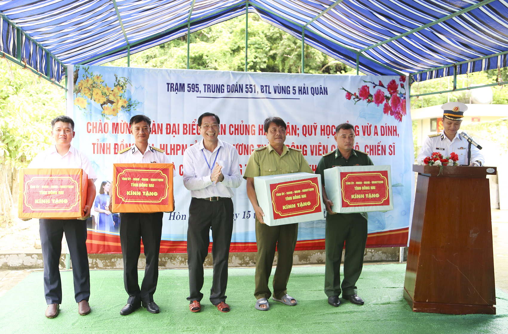 Sáng 15/9, tiếp tục hành trình đi thăm các đảo thuộc vùng biển Tây Nam và Nhà giàn DK1, đoàn đại biểu Quỹ học bổng Vừ A Dính, Câu lạc bộ “Vì Hoàng Sa - Trường Sa thân yêu”, UBND tỉnh Đồng Nai, Hội Liên hiệp phụ nữ tỉnh Hải Dương và Quân chủng Hải quân do đồng chí Võ Văn Phi, Phó Chủ tịch UBND tỉnh Đồng Nai dẫn đầu đã đến thăm, động viên cán bộ, chiến sĩ đang công tác tại Trạm ra đa 595, Trung đoàn 551, Vùng 5 Hải quân cùng các lực lượng đang đóng quân trên đảo.