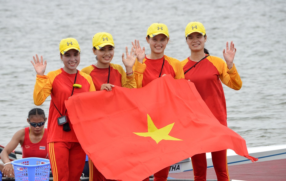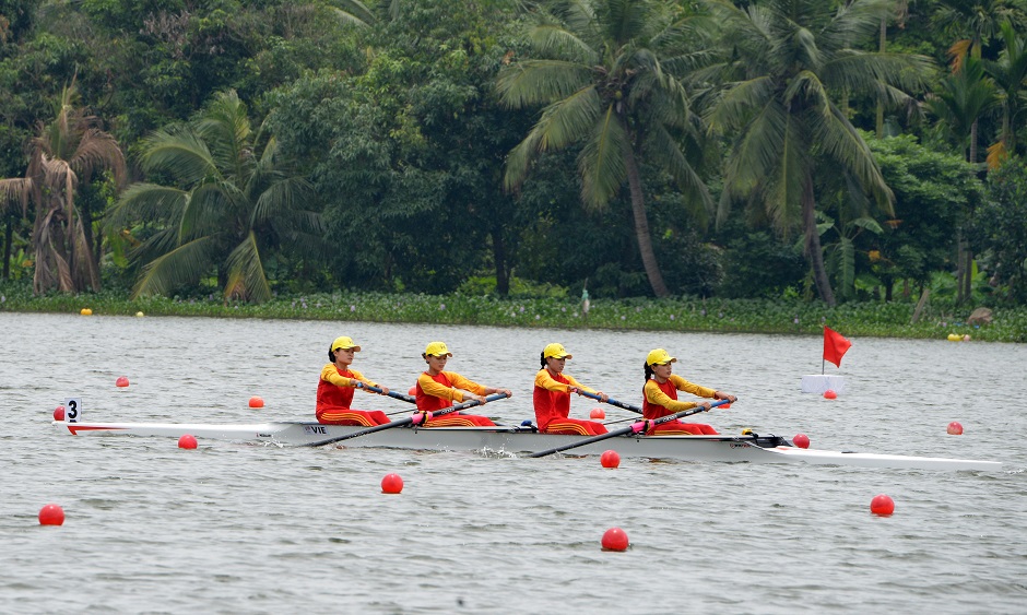 Đúng như dự báo, 4 VĐV trẻ của Việt Nam gồm Phạm Thị Ngọc Anh, Lê Thị Hiền, Hà Thị Vui và Dư Thị Bông tự tin xuất phát thi đấu ở nội dung thuyền 4 nữ hạng nặng mái chèo đơn khi đồng hồ đã điểm 11 giờ 30 phút. Trước sự cổ vũ của đông đảo khán giả nhà cùng với tinh thần thi đấu tự tin, mặc dù bị đội nữ Indonesia tăng tốc đeo bám quyết liệt nhưng 4 “cô gái vàng” của Việt Nam đã về đích với thành tích 7 phút 4 giây 58, bỏ khá xa đội về nhì, ba là Indonesia và Thái Lan, mang về thêm 1 tấm HCV quí giá cho môn Rowing ở ngày thi đấu thứ 3.