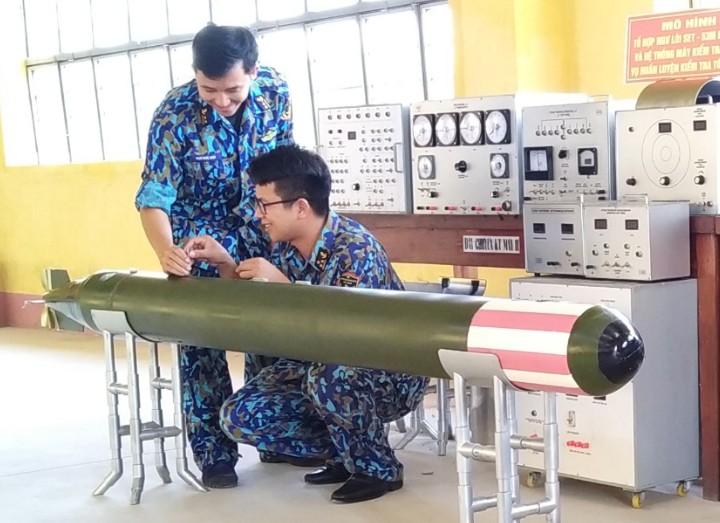 Sĩ quan trẻ của Trạm 93, Trung tâm Bảo đảm Kỹ thuật, Vùng 2 Hải quân đang hiệu chỉnh các thông số kỹ thuật trên tổ hợp ngư lôi. Ảnh: CTV