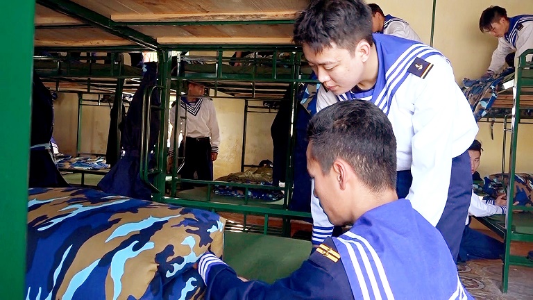 Chiến sĩ Phạm Văn Nghiệp, Lữ đoàn 131 theo dõi Tiểu đội trưởng hướng dẫn gấp chăn, màn