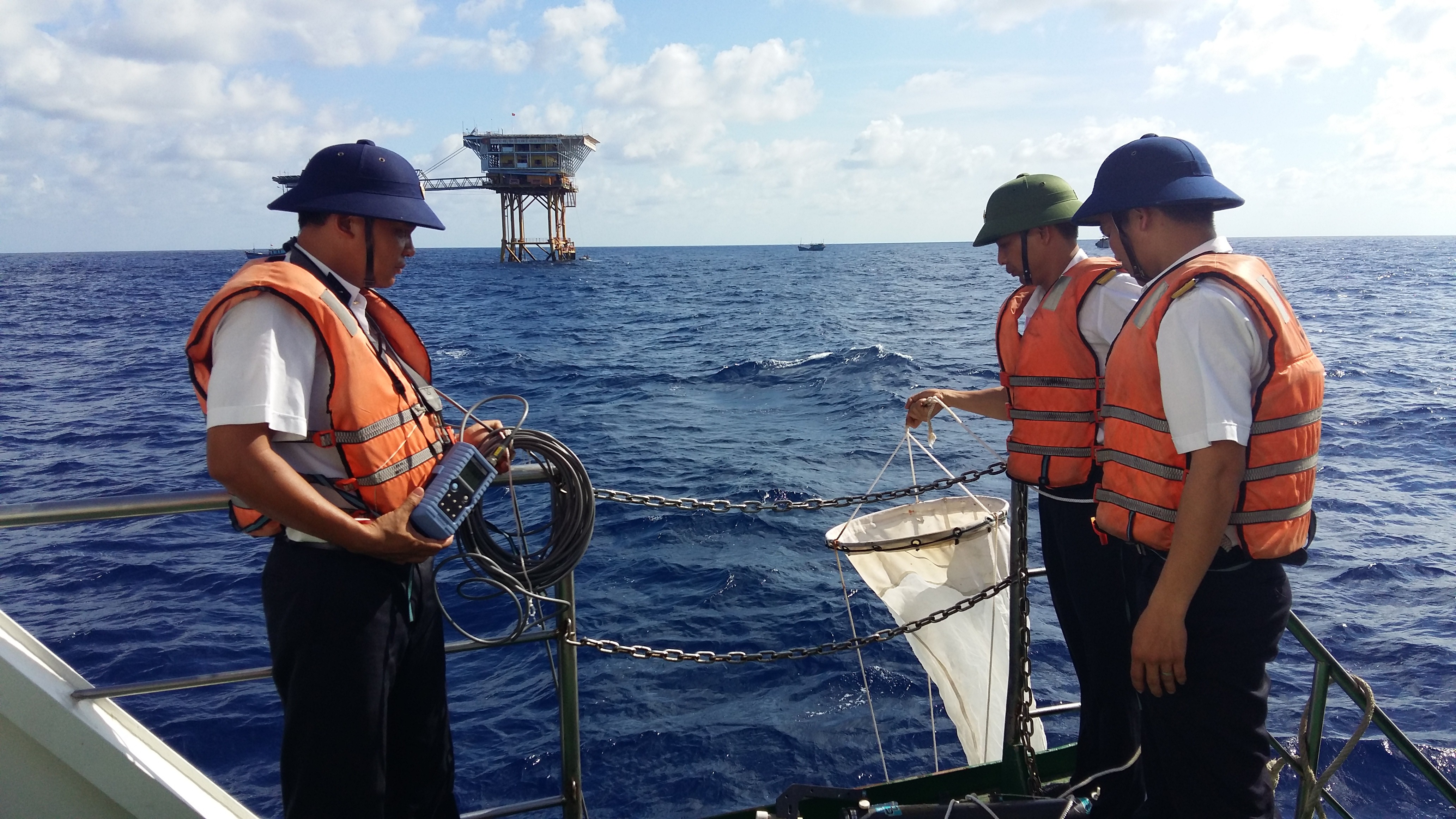 Cán bộ, nhân viên Trung tâm Quan trắc-Phân tích môi trường biển lấy mẫu trên vùng biển thềm lục địa phía Nam. Ảnh: CTV