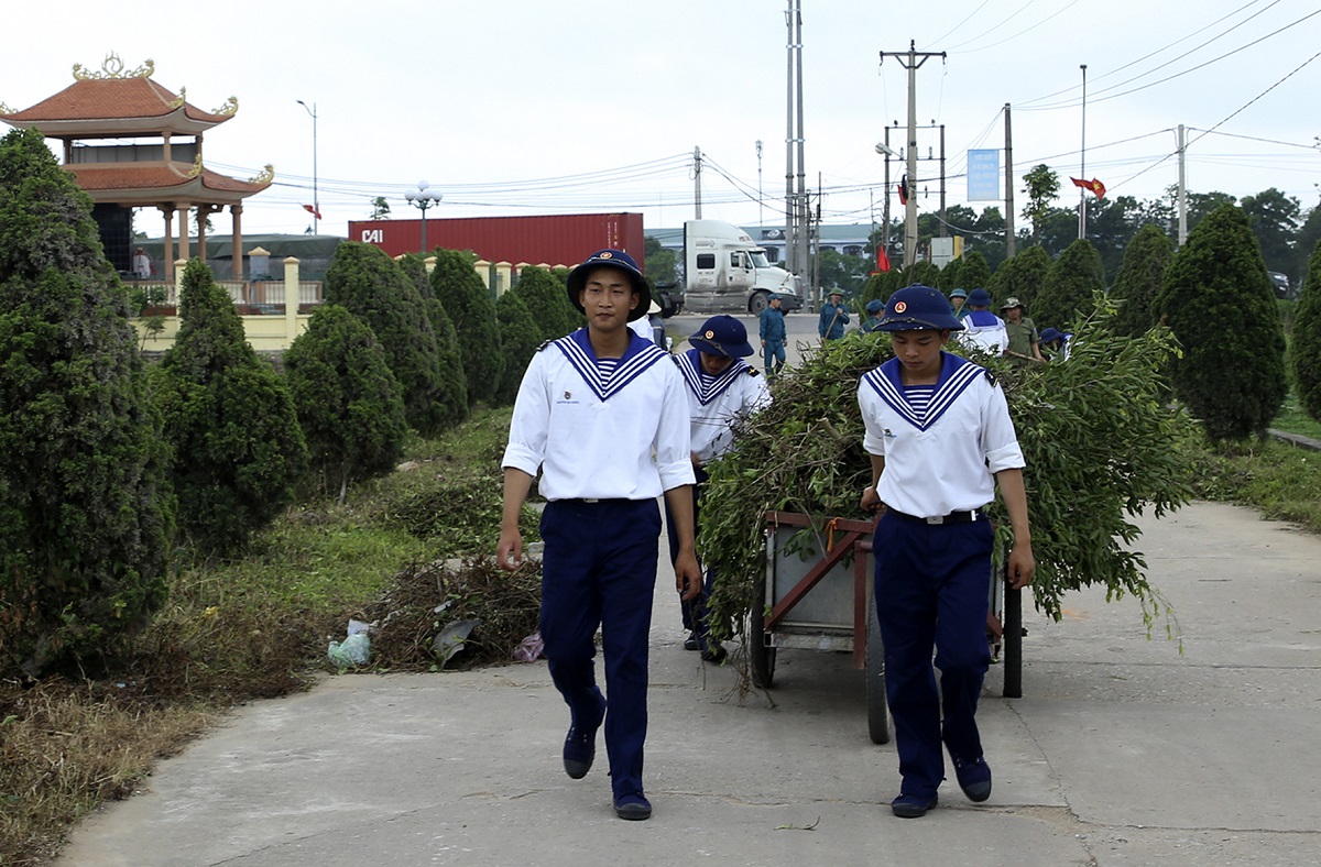 Cán bộ, chiến sĩ Lữ đoàn 147 tham gia vệ sinh môi trường tại xã Tiền Phong, thị xã Quảng Yên, tỉnh Quảng Ninh