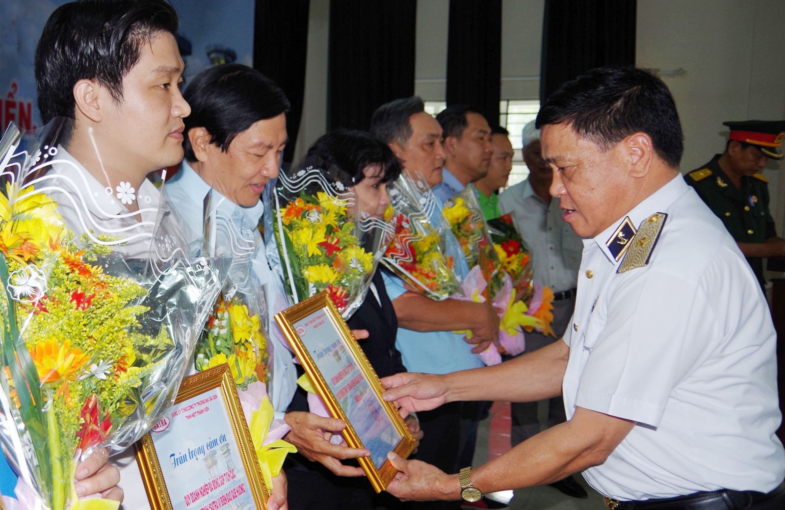Chuẩn Đô đốc Nguyễn Phong Cảnh tặng hoa và thư cảm ơn các đơn vị tài trợ cho chương trình "SATRA" vì biển, đảo quê hương