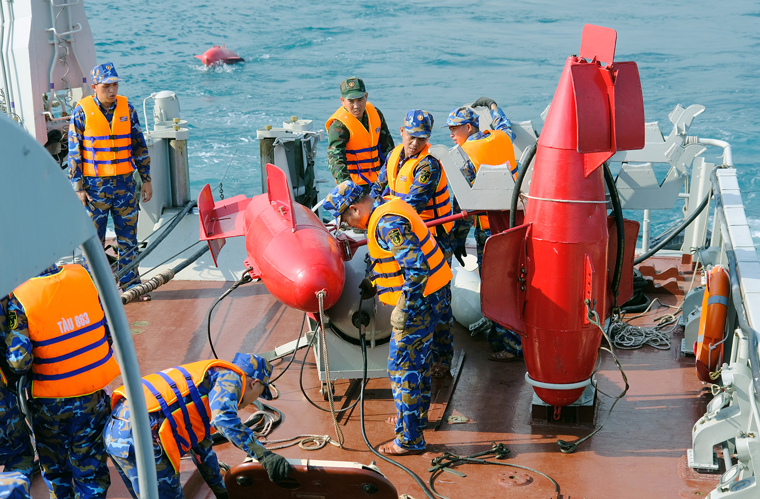 Tàu 863 huấn luyện thả lưới quyét thủy lôi. Ảnh: CTV