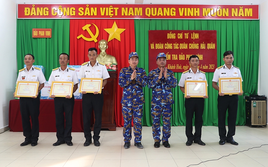 Tư lệnh Hải quân tặng Bằng khen cho các tập thể đạt thành tích xuất sắc đợt kiểm tra tại đảo Phan Vinh. Ảnh: PV