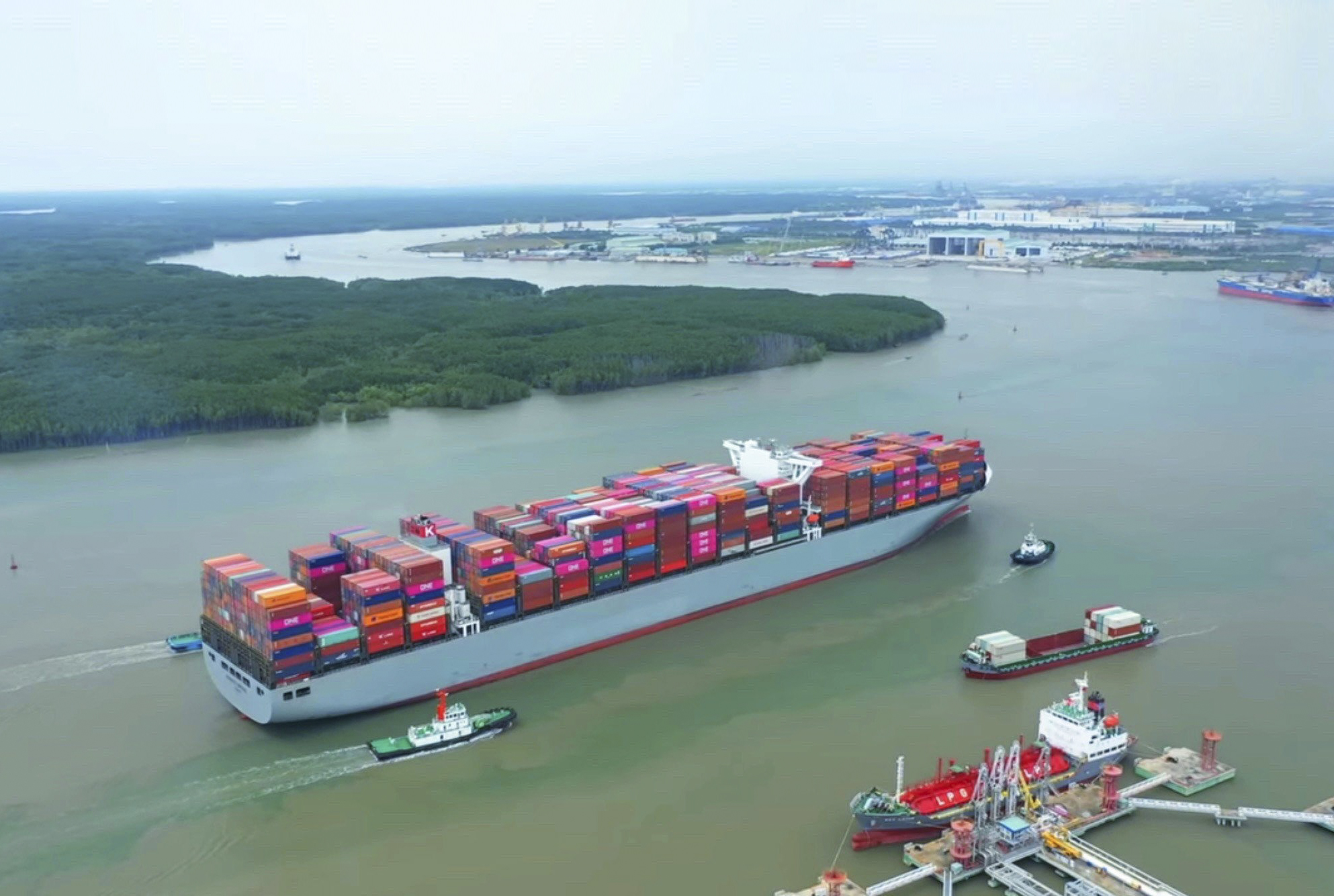 Tàu của Công ty Hoa tiêu Tân cảng dẫn tàu container đi trong luồng hẹp. Ảnh: Quang Tiến