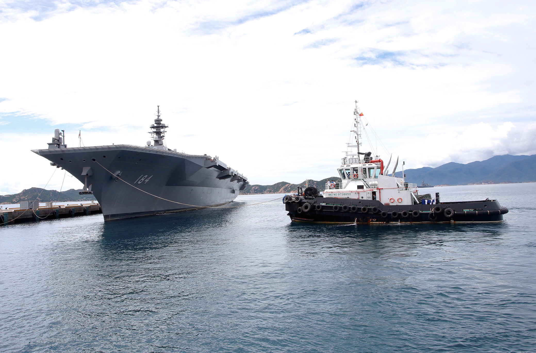 Tàu của Công ty Hoa tiêu Tân cảng dẫn tàu sân bay Pháp cập cảng quốc tế Cam Ranh. Ảnh: Đức Thu