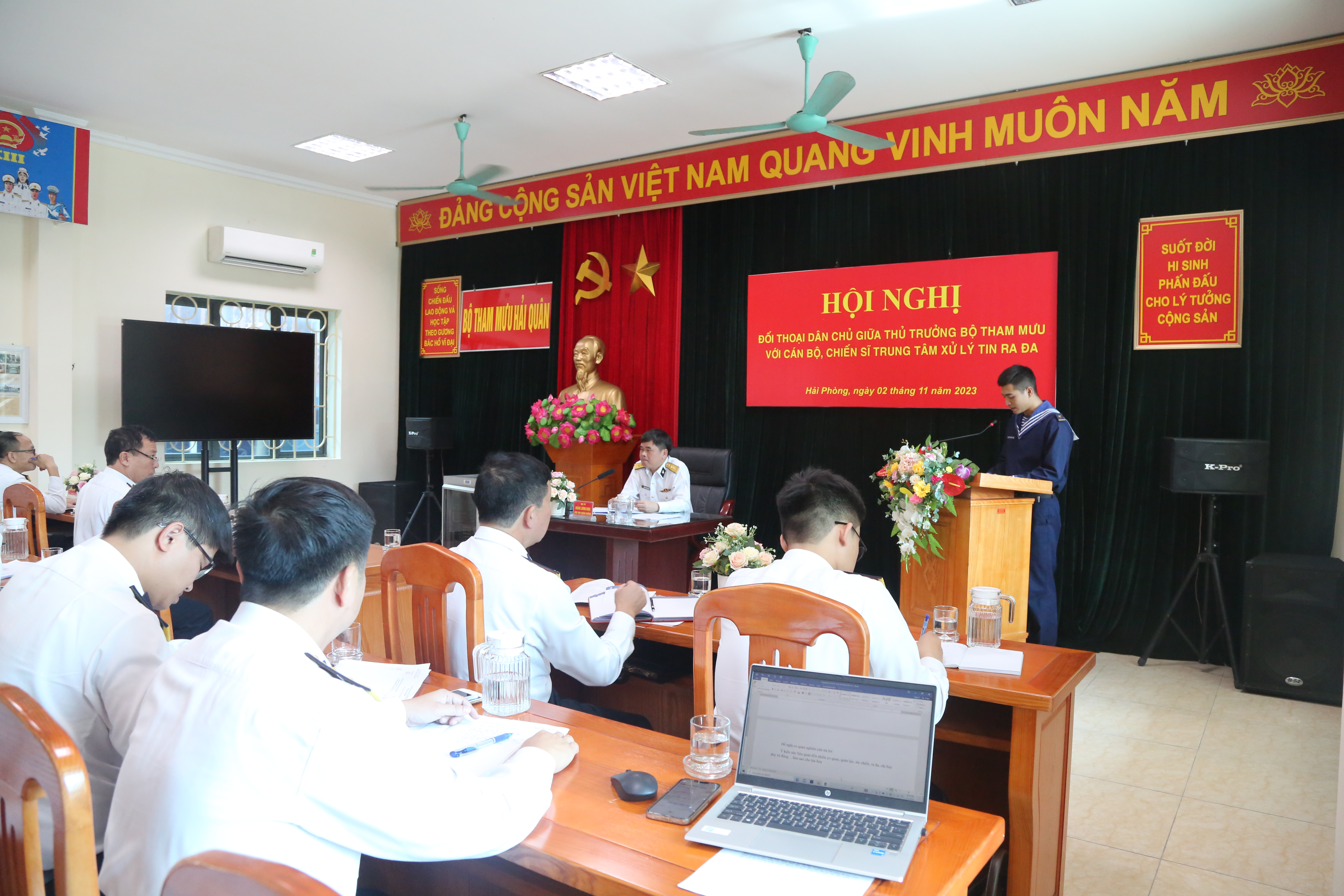 Cùng với các hoạt động ngày chính trị, văn hóa tinh thần, đối thoại dân chủ là một trong những nội dung quan trọng để thực hiện Quy chế dân chủ cơ sở mà Bộ Tham mưu Hải quân vừa thực hiện ở Trung tâm xử lý tin ra đa. Thông qua đối thoại dân chủ giúp cấp ủy, chỉ huy nắm, giải quyết kịp thời các vấn đề về tư tưởng, bảo đảm quyền lợi chính đáng của bộ đội và góp phần xây dựng đơn vị VMTD mẫu mực, tiêu biểu.
