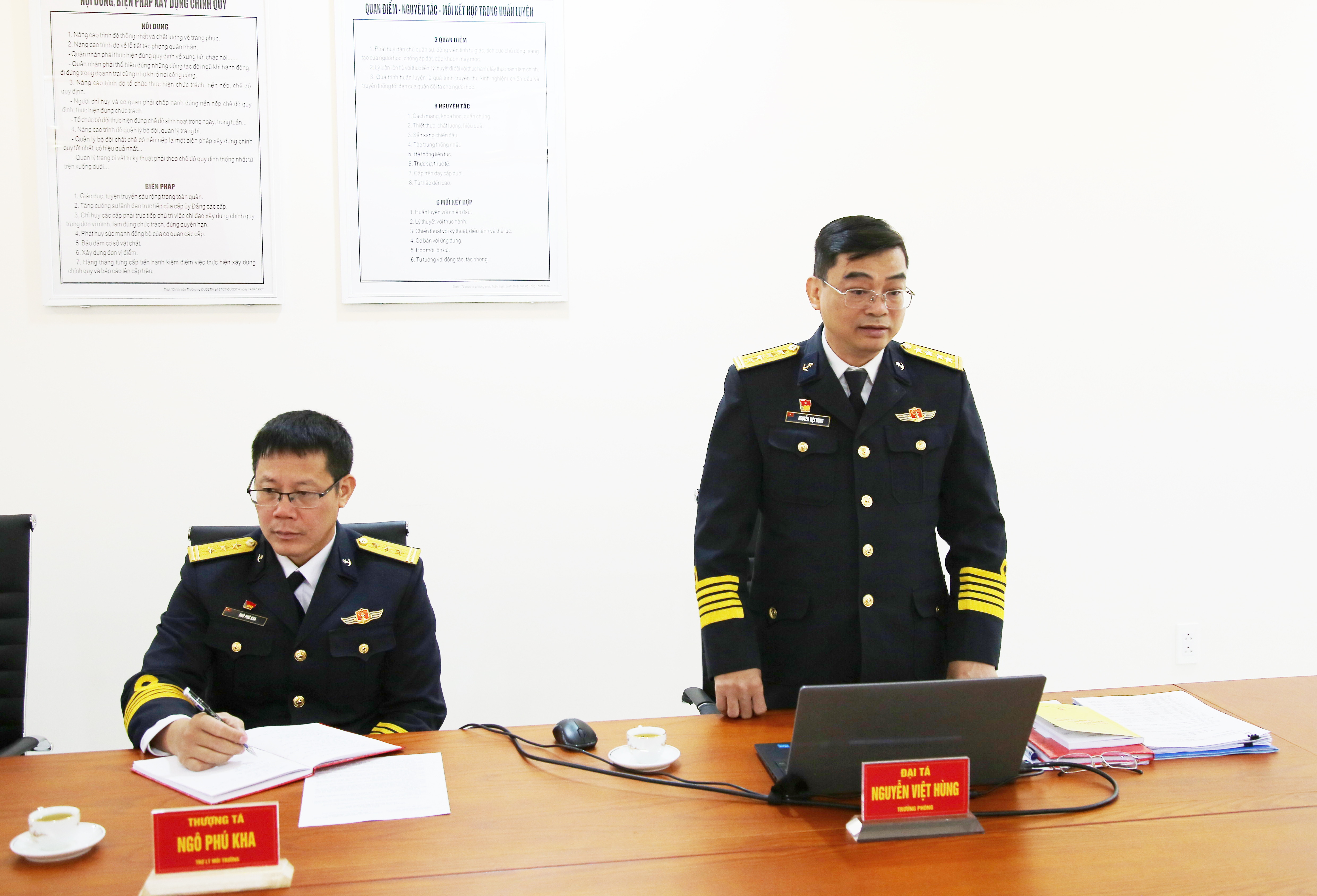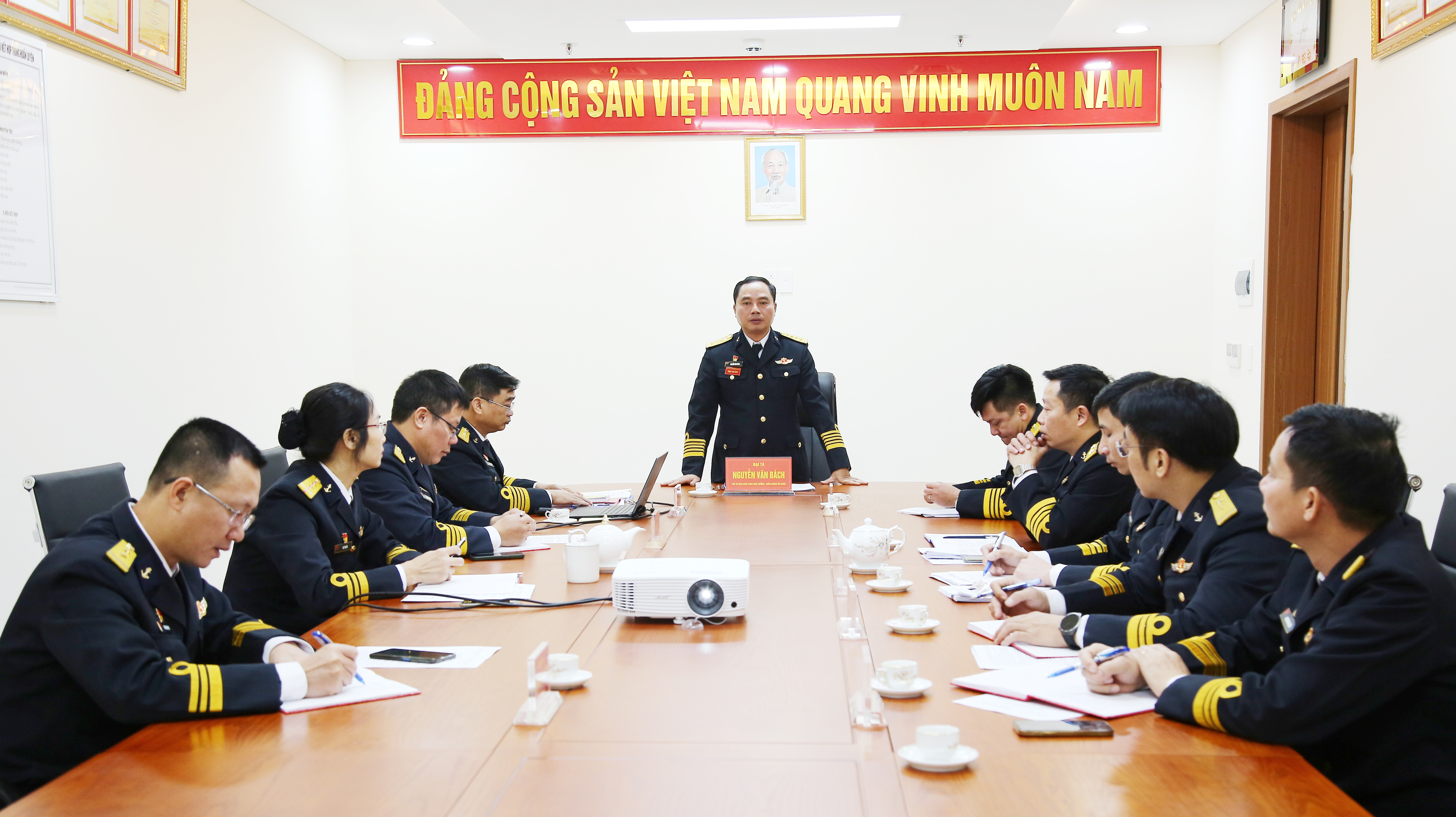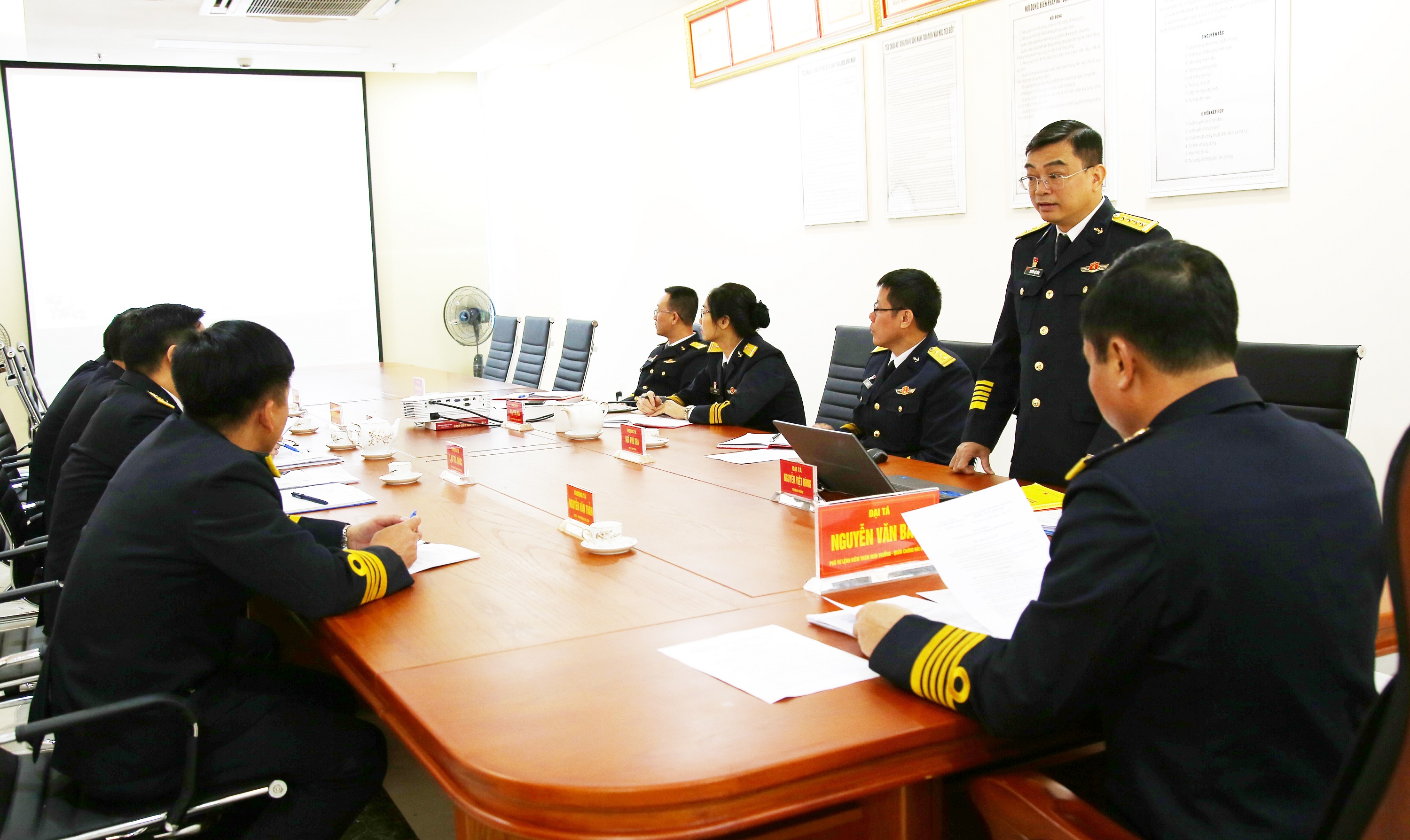 Tại buổi làm việc, Đại tá Nguyễn Việt Hùng, Trưởng phòng Khoa học quân sự báo cáo với đồng chí Phó Tư lệnh, Tham mưu trưởng Hải quân về kết quả hoạt động năm 2024 và một số nhiệm vụ trong năm năm 2025 và những năm tiếp theo của Phòng Khoa học quân sự.