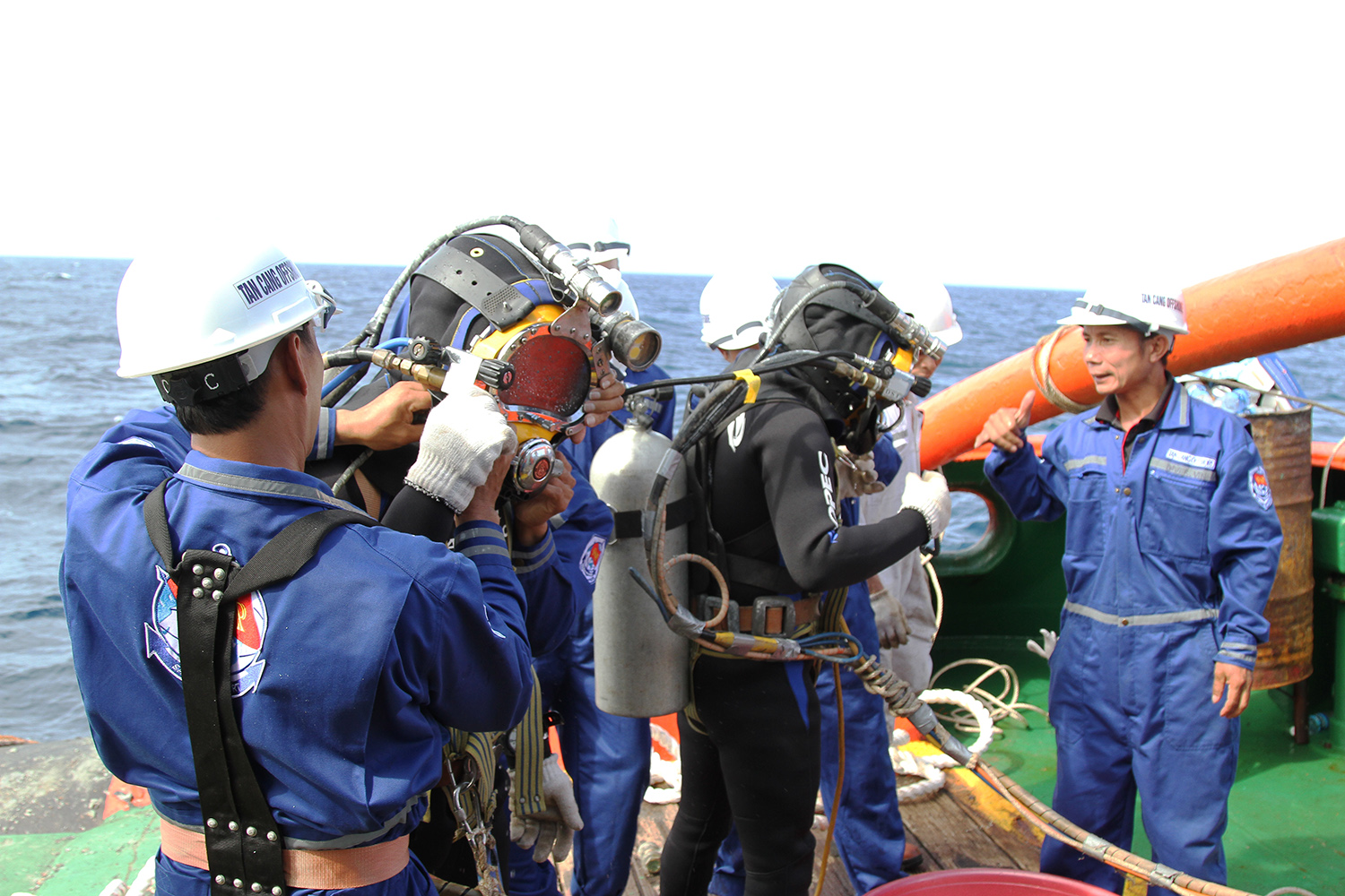 Kíp thợ lặn của Quân cảng Sài Gòn chuẩn bị thiết bị lặn