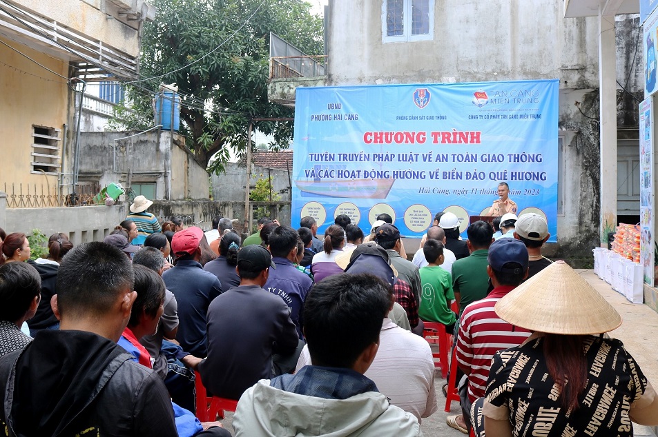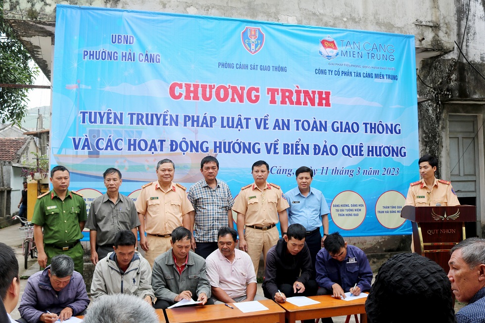 Sáng 11/3, tại phường Hải Cảng, TP. Quy Nhơn, tỉnh Bình Định, Công ty Cổ phần Tân Cảng miền Trung phối hợp với Phòng Cảnh sát giao thông, Công an tỉnh Bình Định và UBND phường Hải Cảng tổ chức tuyên truyền pháp luật về an toàn giao thông (ATGT) đường thủy nội địa kết hợp thực hiện công tác dân vận hướng về biển, đảo quê hương trên địa bàn.