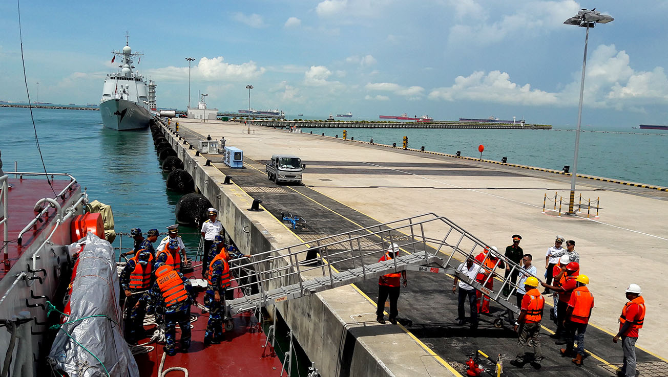 Thủy thủ tàu 381 và cảng vụ Singgapore đưa cầu thang lên tàu