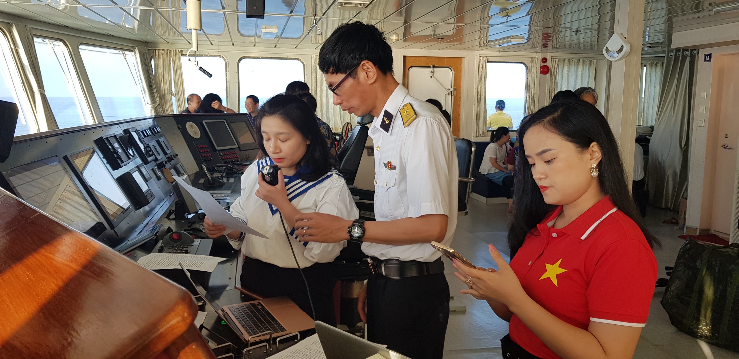 Trung tá Vũ Văn Hưởng cùng đồng nghiệp tổ chức buổi phát thanh nội bộ trên Tàu 571