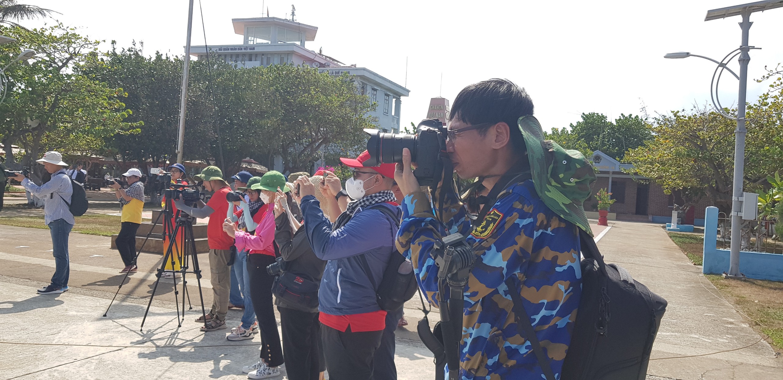 Trung tá Vũ Văn Hưởng (ngoài cùng bên phải) tác nghiệp ở Trường Sa