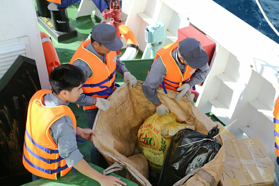 Tàu vào vị trí thuận lợi cho lực lượng chuyển hàng lên nhà giàn thì sự phối hợp giữa tàu và nhà giàn được thực hiện thuần thục. Bộ phận chuyển hàng ở tàu nhanh chóng nhận dây từ các chiến sĩ trên nhà giàn rồi lần lượt buộc từng túi quà và hô to để người trên nhà giàn kéo quà thật nhanh tránh bị sóng táp. Cứ như vậy, người buộc, người kéo theo lệnh của người chỉ huy hai bên.