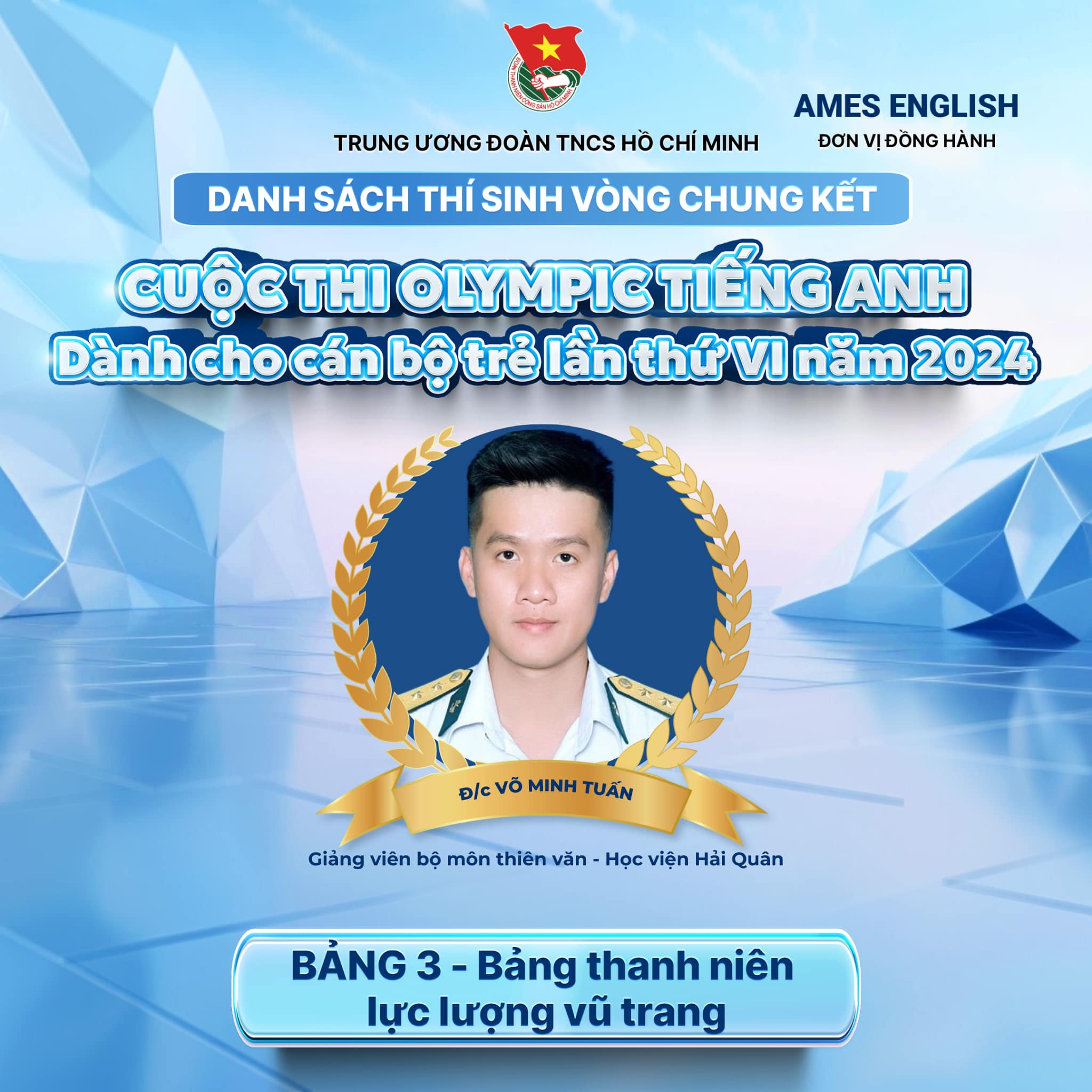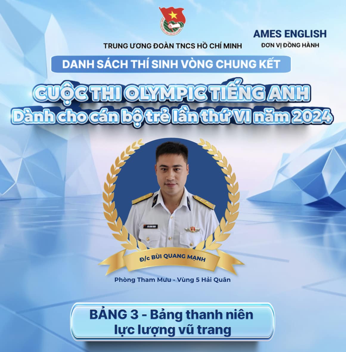 Góp mặt tranh tài tại Bảng 3 dành cho thanh niên lực lượng vũ trang năm nay, Quân chủng Hải quân có 3 cán bộ trẻ xuất sắc được tuyển chọn vào vòng chung kết đó là: Thượng úy Võ Minh Tuấn, Giảng viên Bộ môn Thiên văn, Khoa Hàng hải, Học viện Hải quân; Trung úy Trần Quang Huy, Trợ lý Bảo vệ - Dân vận, Đoàn Kinh tế quốc phòng Hải quân và Trung úy QNCN Bùi Quang Mạnh, Phòng Tham mưu, Bộ Tư lệnh Vùng 5.