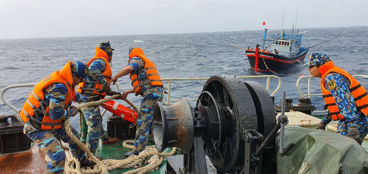 Tàu Trường Sa 18 của Lữ đoàn 955, Vùng 4 cứu kéo tàu cá ngư dân gặp nạn trên biển. Ảnh: CTV