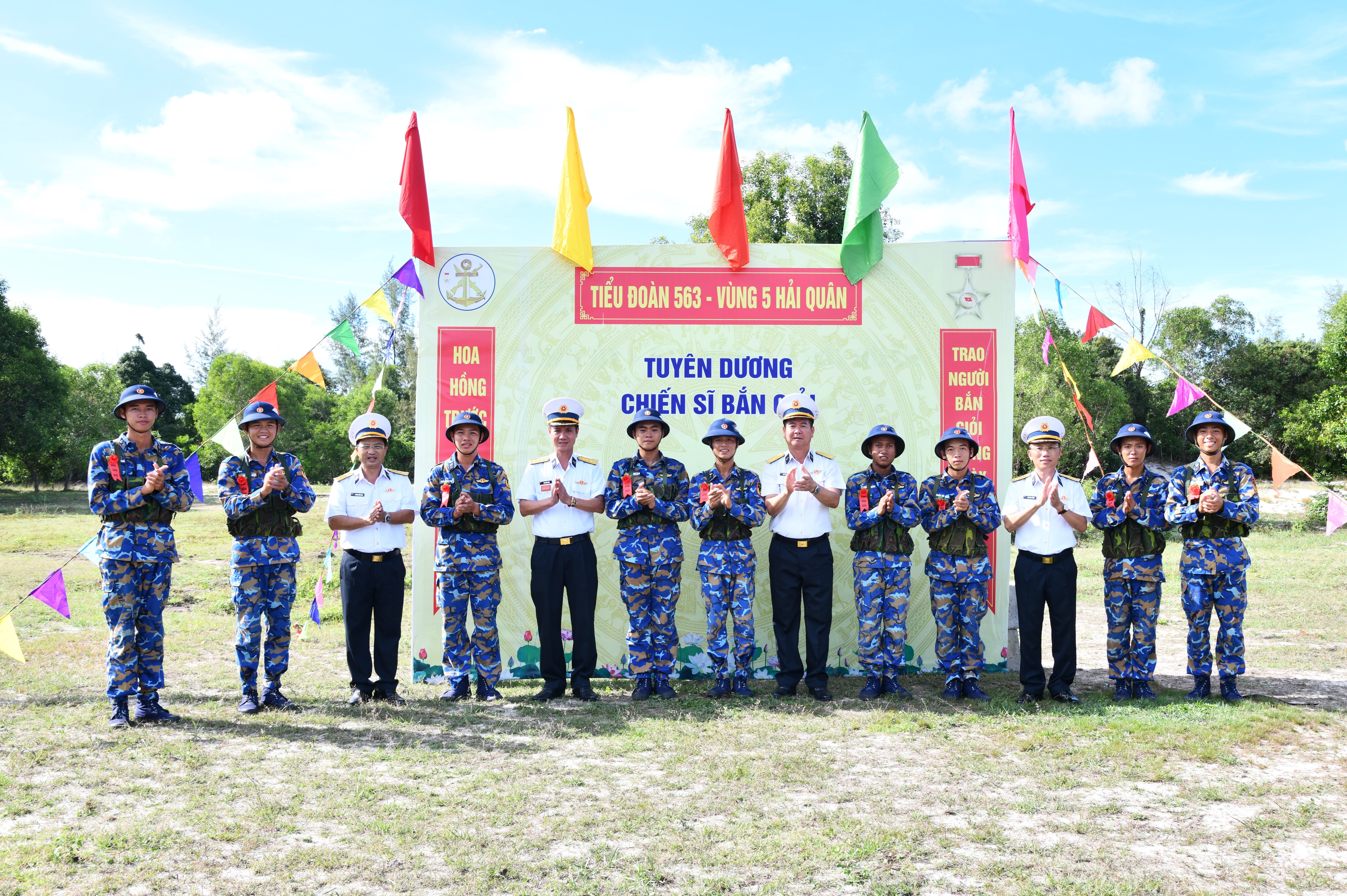 Đại tá Nguyễn Quốc Doanh và thủ trưởng Bộ Tư lệnh Vùng 5 tặng hoa các chiến sĩ Tiểu đoàn 563 đạt thành tích bắn giỏi