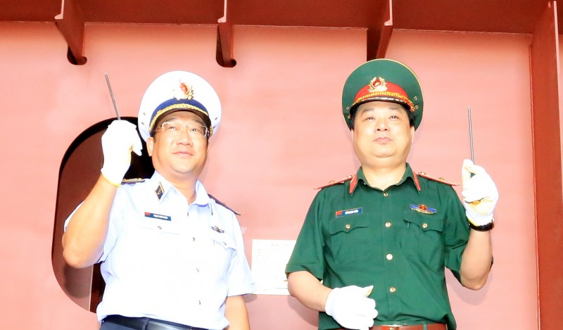 Thủ trưởng Bộ Tư lệnh Hải quân và Tổng cục Công nghiệp Quốc phòng làm thủ tục gắn biển tại lễ đặt ky