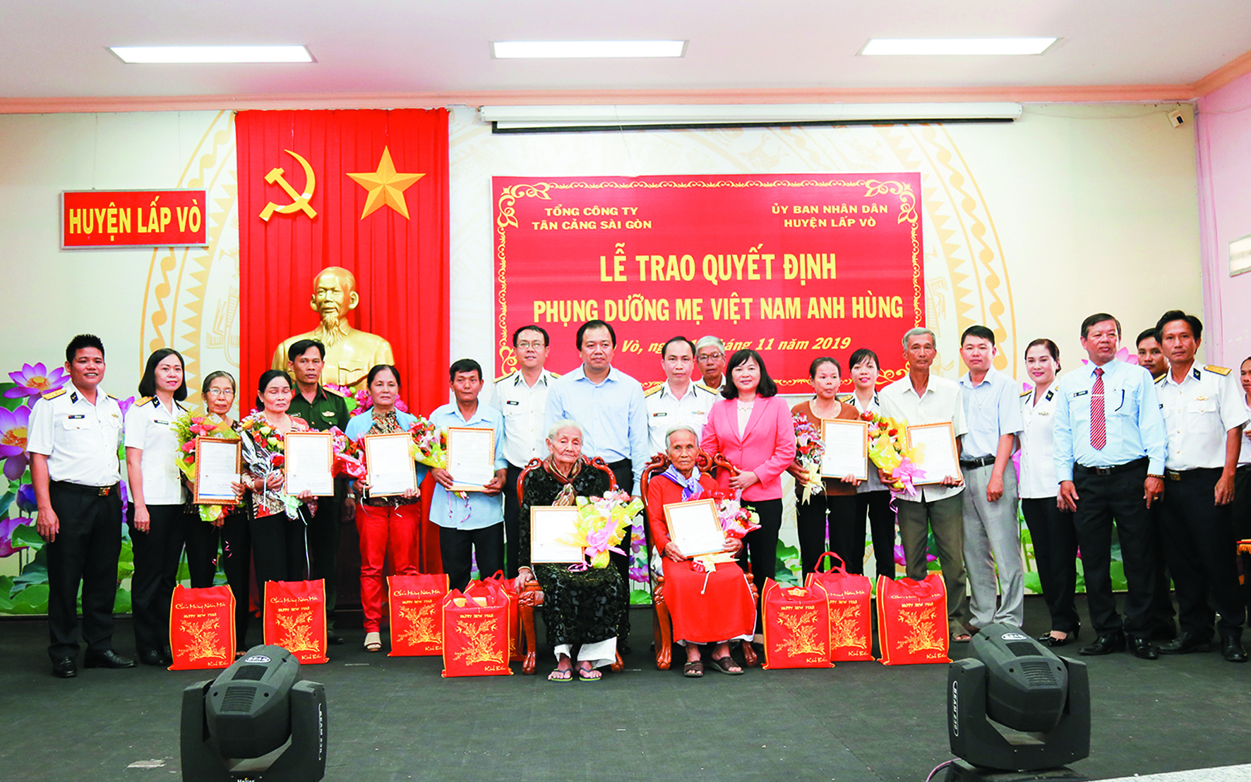 Tổng công ty Tân cảng Sài Gòn trao quyết định phụng dưỡng suốt đời 9 Mẹ Việt Nam Anh hùng tại huyện Lấp Vò, tỉnh Đồng Tháp. Ảnh: Quang Tiến