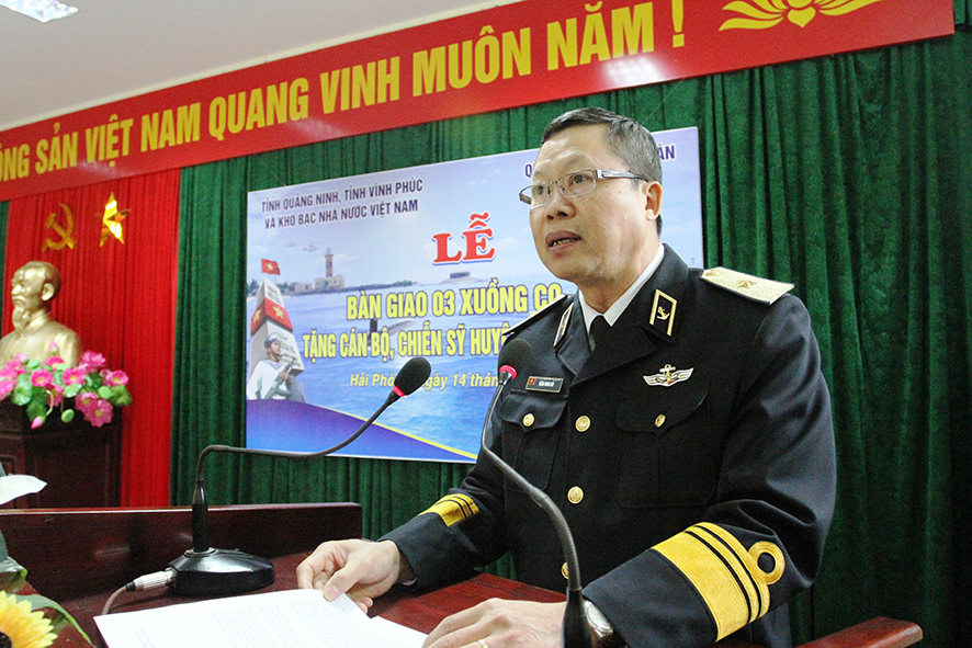 Phát biểu tại buổi lễ, Chuẩn Đô đốc Đặng Minh Hải cảm ơn tình cảm, trách nhiệm của đảng bộ, chính quyền, quân và dân 2 tỉnh Quảng Ninh, Vĩnh Phúc và cán bộ, nhân viên Kho bạc Nhà nước Việt Nam với chủ quyền biển, đảo Tổ quốc nói chung và bộ đội Trường Sa nói riêng.