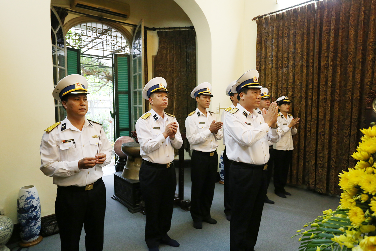 Chuẩn Đô đốc Phạm Văn Vững cùng đại biểu các cơ quan chức năng Quân chủng thắp hương Đại tướng Võ Nguyên Giáp