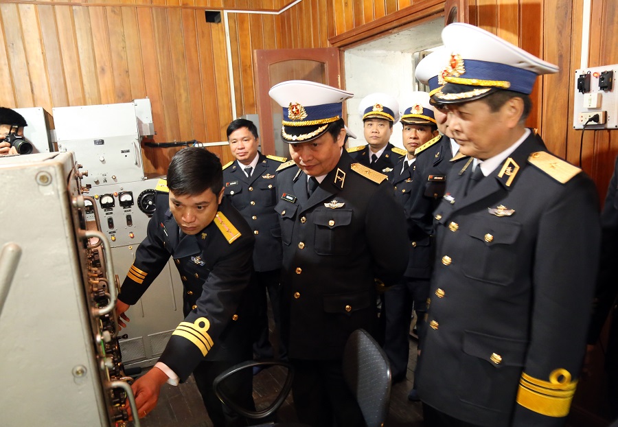 Thiếu tướng Trần Hoài Trung kiểm tra hoạt động của kíp trắc thủ tại Trạm rađa 500, Vùng 1 Hải quân