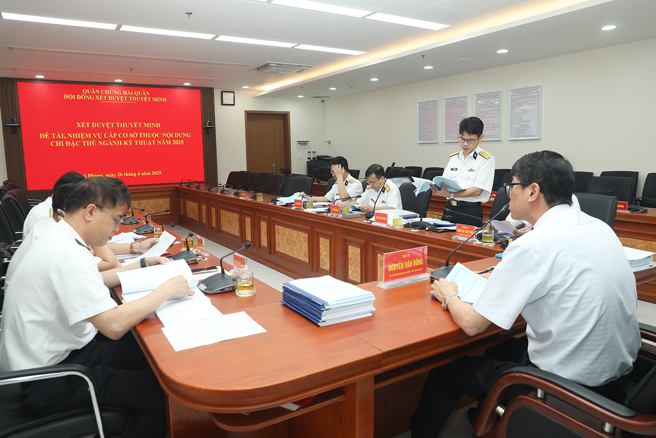 Đại tá Nguyễn Văn Đồng, Phó Tham mưu trưởng Hải quân, Chủ tịch Hội đồng xét duyệt thuyết minh chủ trì. Cùng dự có thành viên hội đồng và đơn vị thực hiện.