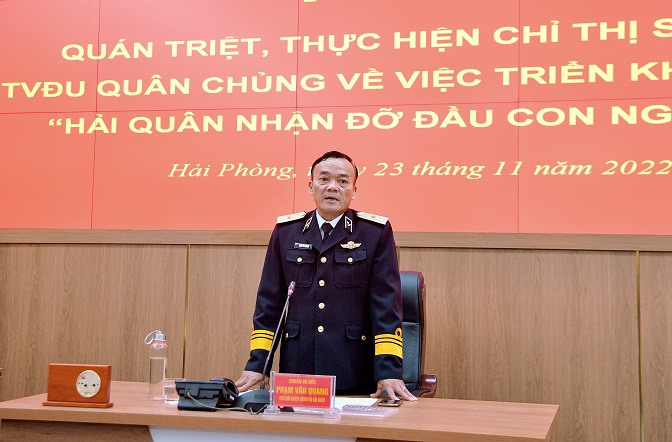 Sáng 23/11, tại Bộ Tư lệnh Vùng 1 Hải quân (huyện Thủy Nguyên, TP. Hải Phòng), Cục Chính trị Hải quân tổ chức Hội nghị quán triệt, thực hiện Chỉ thị số 1078 của Thường vụ Đảng uỷ Quân chủng về việc triển khai hoạt động “Hải quân nhận đỡ đầu con ngư dân”. Chuẩn Đô đốc Phạm Văn Quang, Phó Chủ nhiệm Chính trị Hải quân chủ trì.