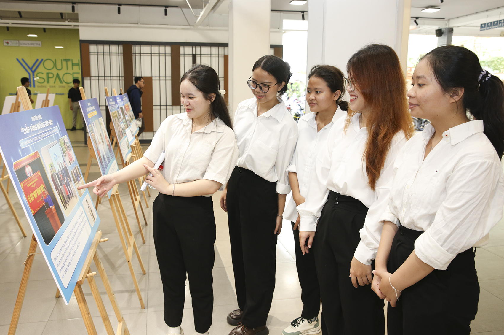 Các em học sinh tham quan triển lãm ảnh về chặng đường hoạt động của quỹ