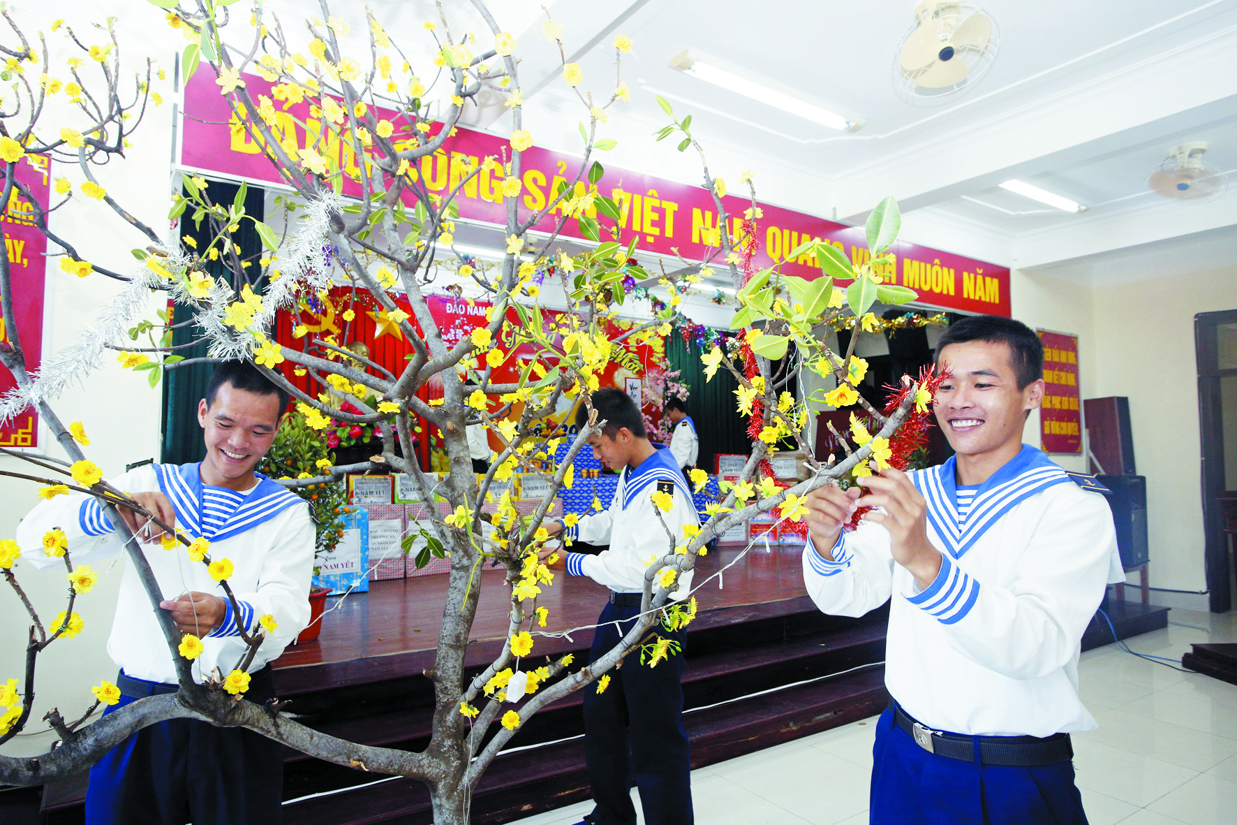 Chiến sĩ trẻ đảo Nam Yết trang trí cành mai tại phòng đón giao thừa