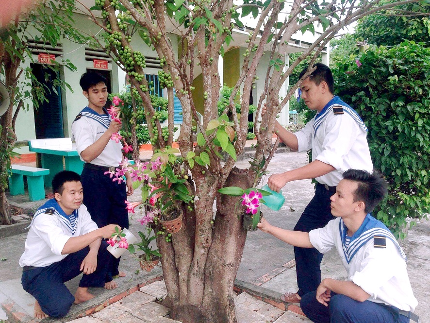 Tới đỉnh đồi, hình ảnh đầu tiên khi chúng tôi nhìn thấy là các chiến sĩ đang quây quần bên gốc sung trĩu quả có nhiều giỏ lan rừng đã nở, họ vừa chăm sóc cây, vừa cắt tóc cho nhau. Cây và hoa ở đây hiểu lòng người chăm sóc, nó rộ hoa, sai quả đúng vào dịp tết, làm cho không khí đón tết của bộ đội cũng trở lên rộn ràng, ấm áp hơn.