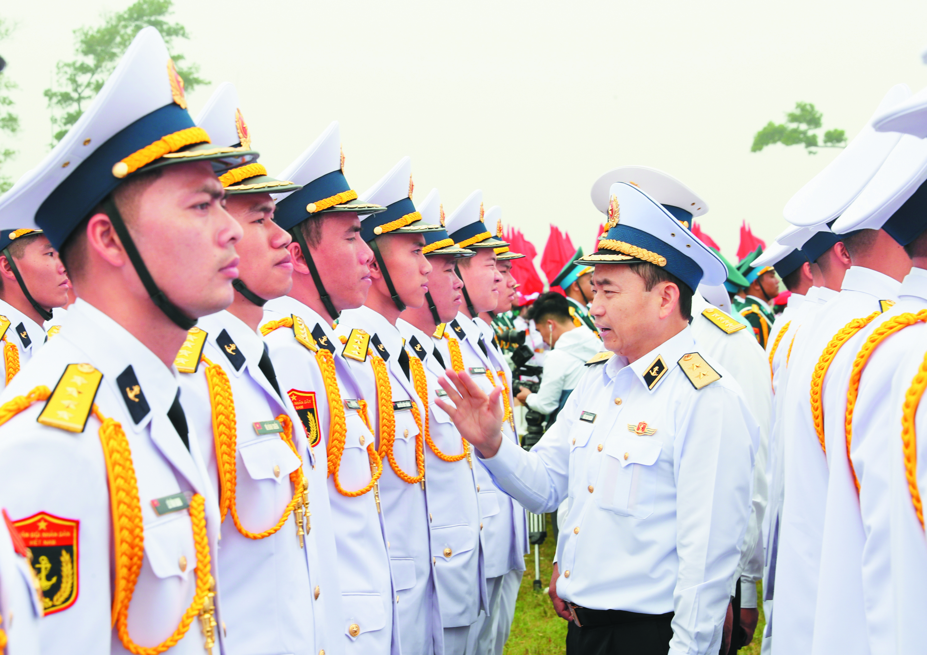 Phó Đô đốc Trần Thanh Nghiêm kiểm tra lễ tiết tác phong khối sĩ quan Hải quân luyện tập diễu binh, diễu hành kỷ niệm 50 năm giải phóng miền Nam, thống nhất đất nước