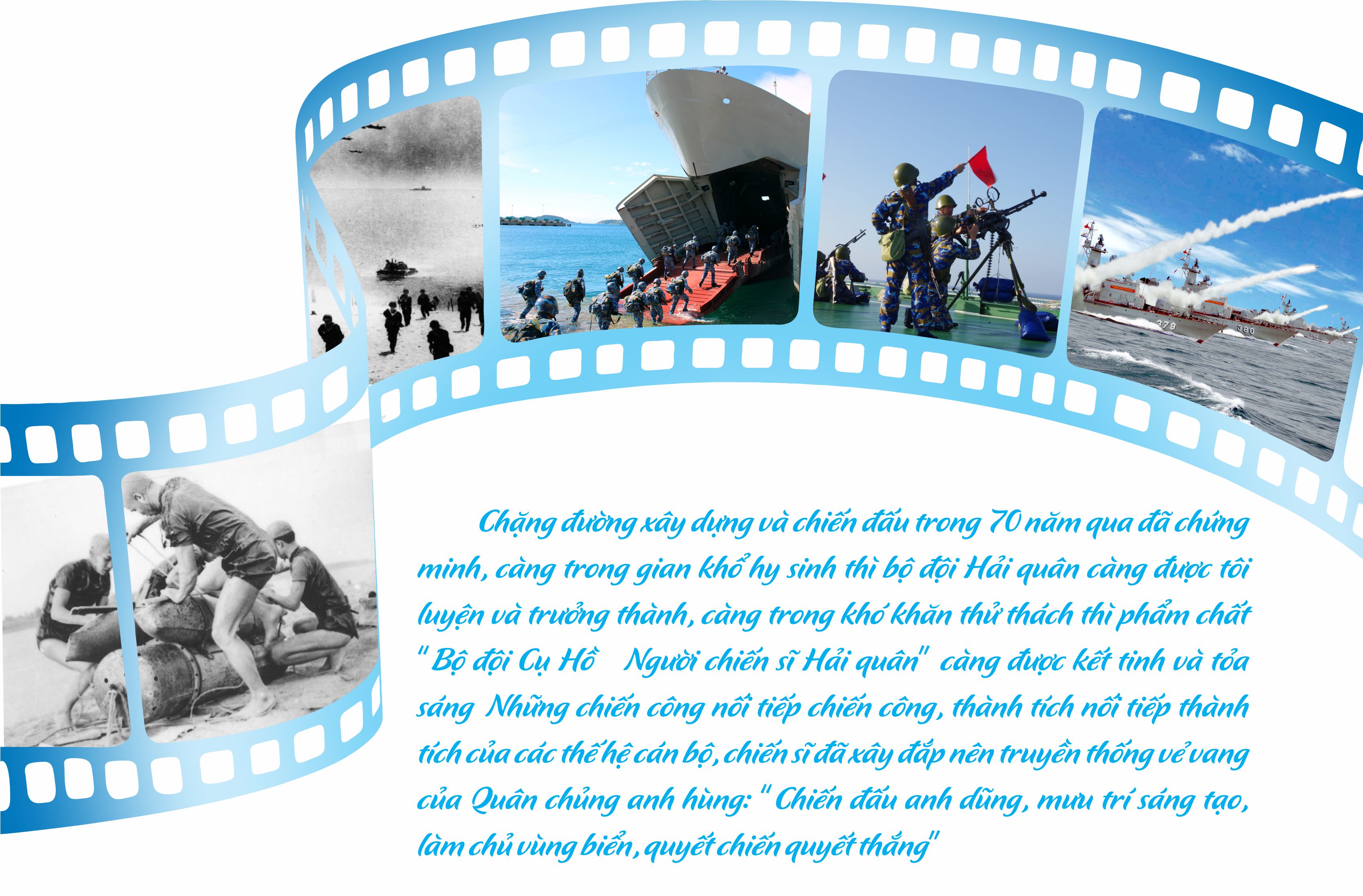 Chặng đường xây dựng và chiến đấu trong 70 năm qua đã chứng minh, càng trong gian khổ hy sinh thì bộ đội Hải quân càng được tôi luyện và trưởng thành, càng trong khó khăn thử thách thì phẩm chất “Bộ đội Cụ Hồ - Người chiến sĩ Hải quân” càng được kết tinh và tỏa sáng. Những chiến công nối tiếp chiến công, thành tích nối tiếp thành tích của các thế hệ cán bộ, chiến sĩ đã xây đắp nên truyền thống vẻ vang của Quân chủng anh hùng: “Chiến đấu anh dũng, mưu trí sáng tạo, làm chủ vùng biển, quyết chiến quyết thắng”.