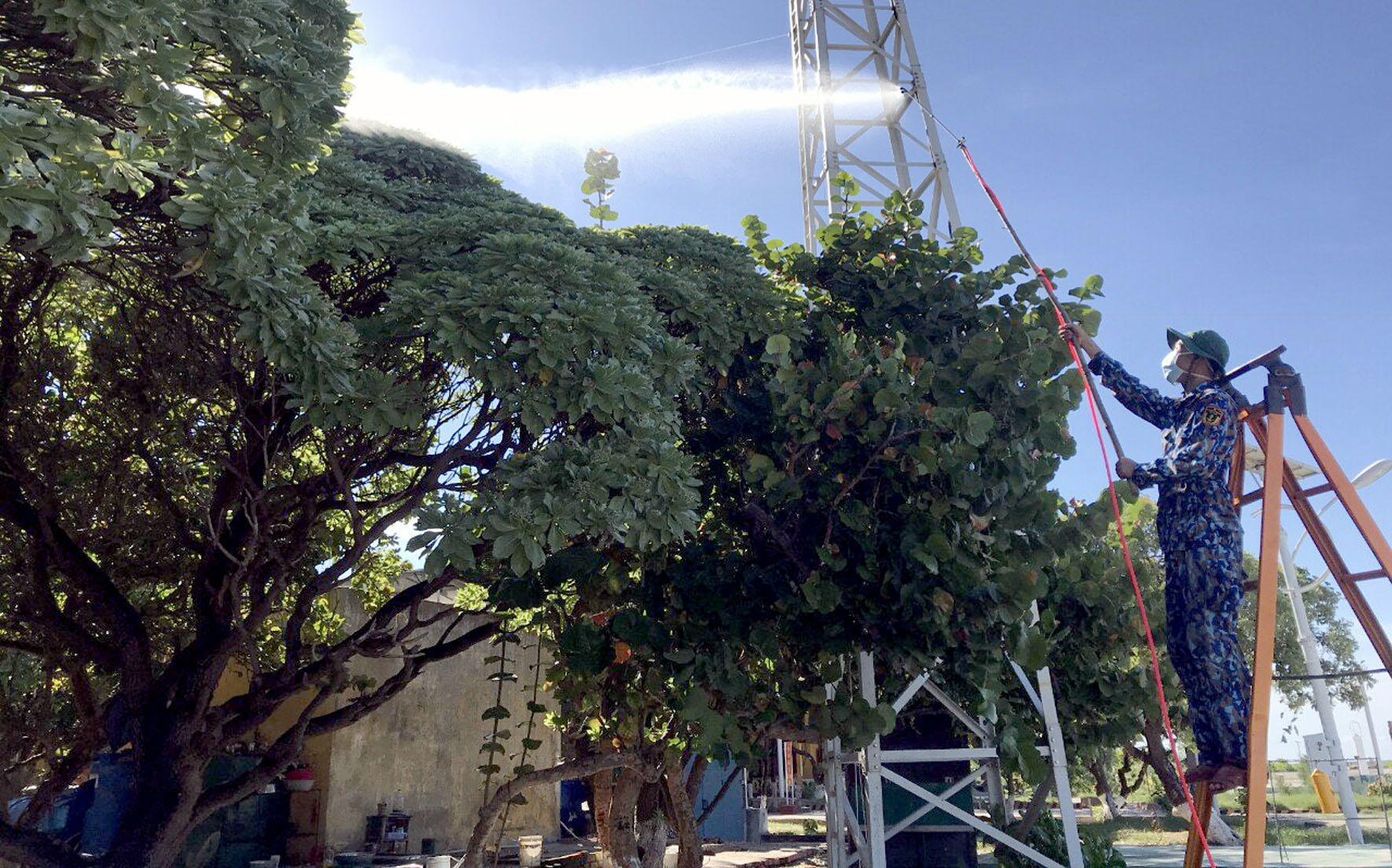Bộ đội đảo Sinh Tồn phun thuốc bảo vệ cây xanh trên đảo. Ảnh: CTV