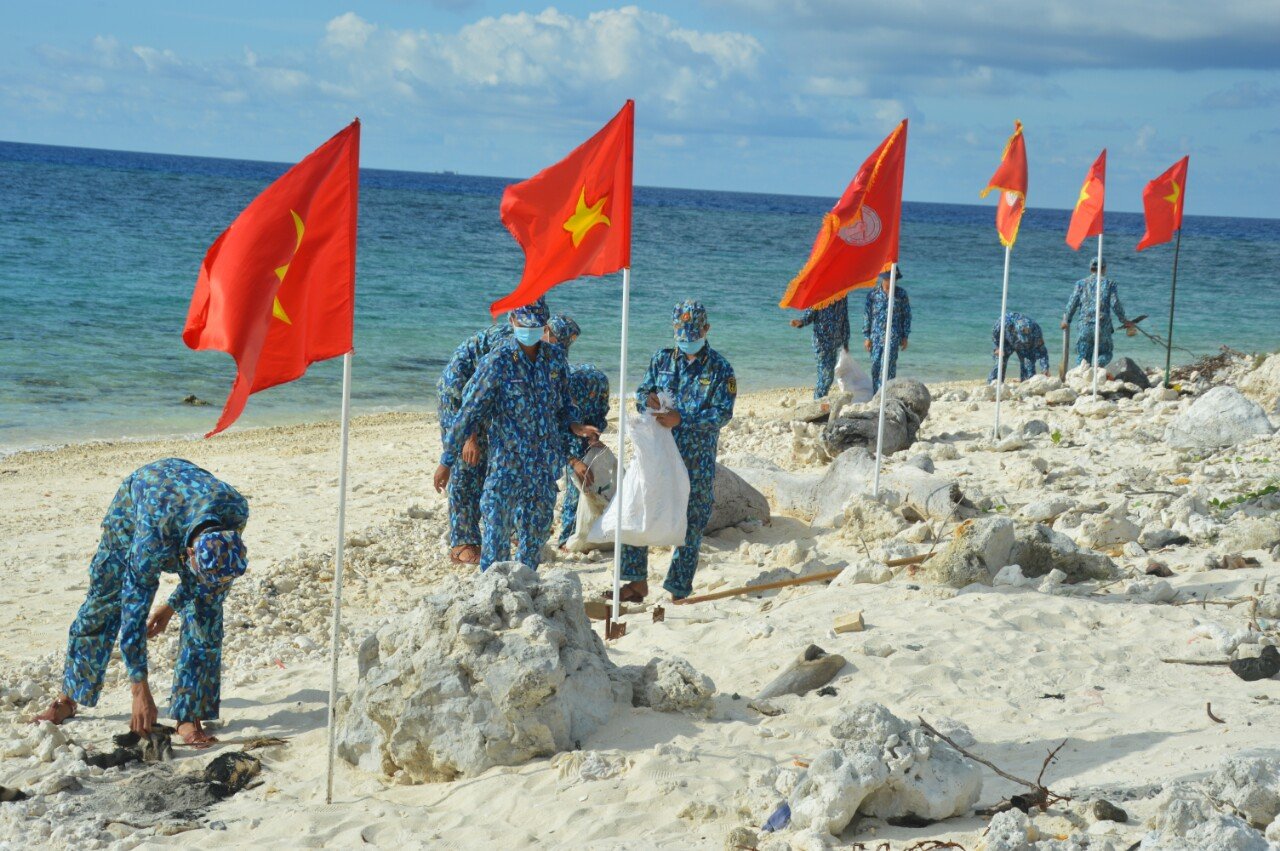 Cán bộ, đoàn viên đảo Sinh Tồn dọn vệ sinh bờ biển