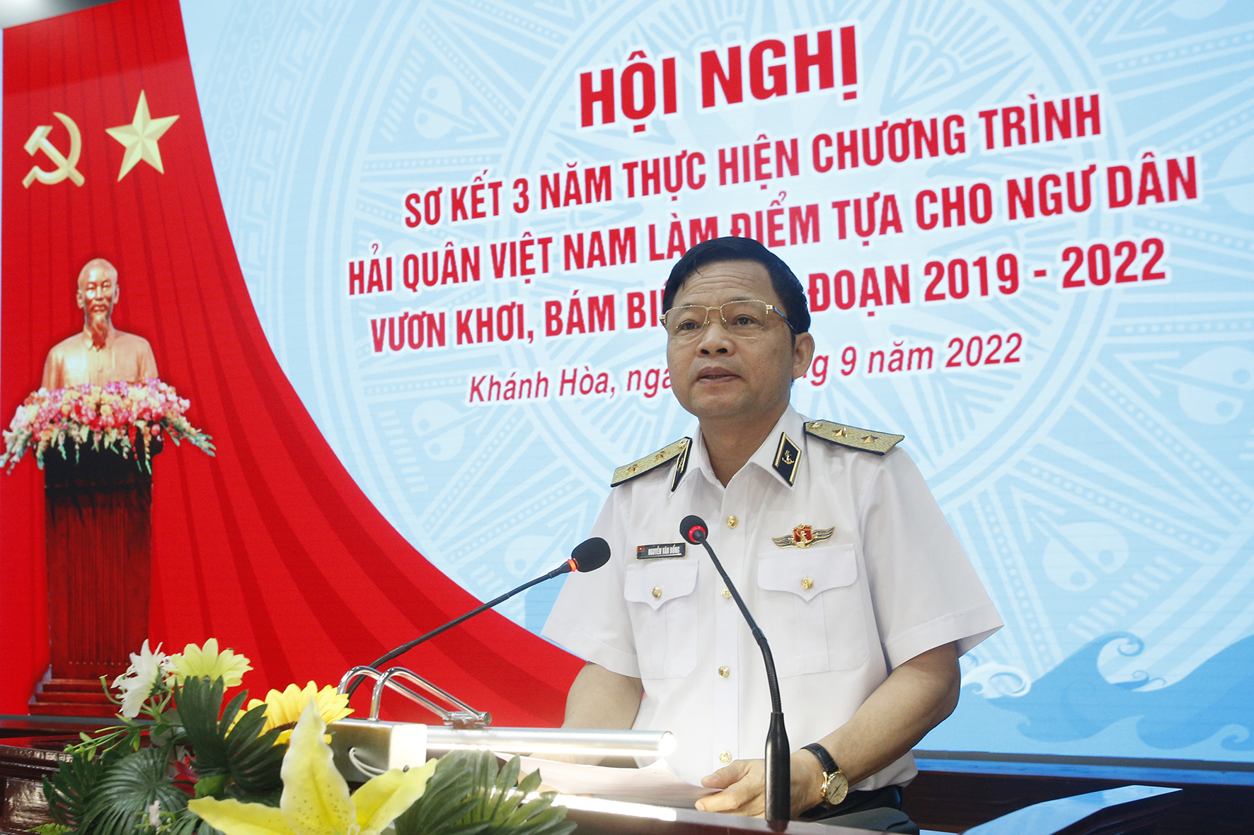 Chuẩn Đô đốc Phạm Văn Luyện, Phó Chủ nhiệm Chính trị Hải quân trình bày báo cáo sơ kết 3 năm thực hiện Chương trình Hải quân Việt Nam làm điểm tựa cho ngư dân vươn khơi, bám biển