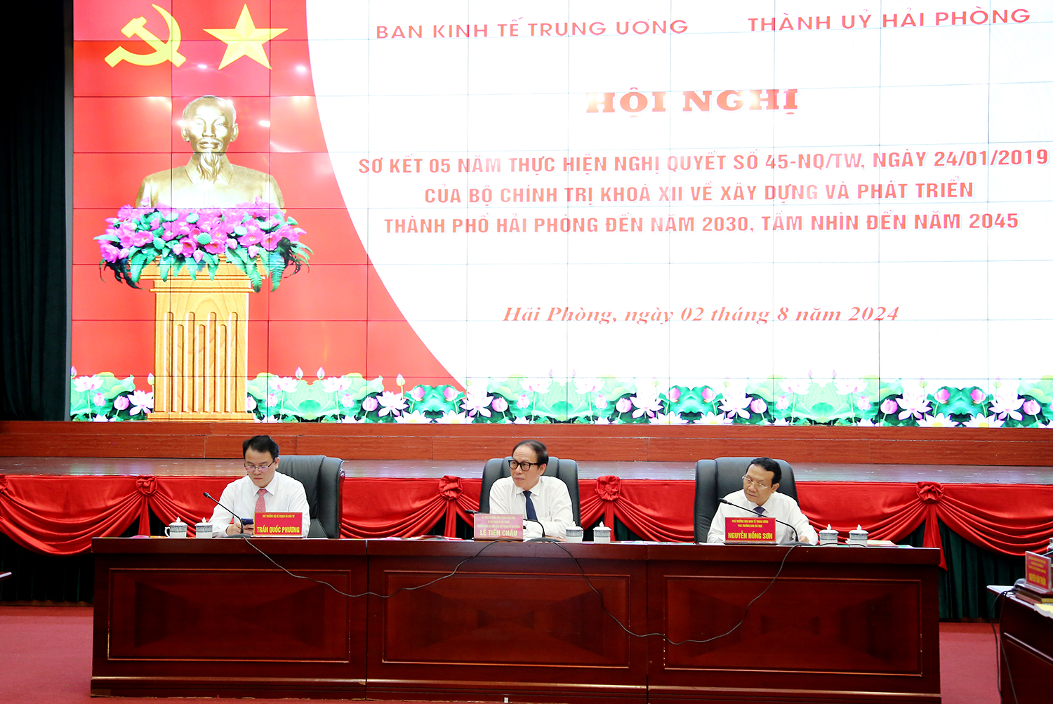 Các đồng chí: Lê Tiến Châu, Ủy viên Trung ương Đảng, Bí thư Thành ủy Hải Phòng; Nguyễn Hồng Sơn, Phó Trưởng ban Kinh tế Trung ương, Phó Trưởng ban Thường trực Ban chỉ đạo Đề án sơ kết thực hiện Nghị quyết số 45; Trần Quốc Phương, Thứ trưởng Bộ Kế hoạch và Đầu tư đồng chủ trì.